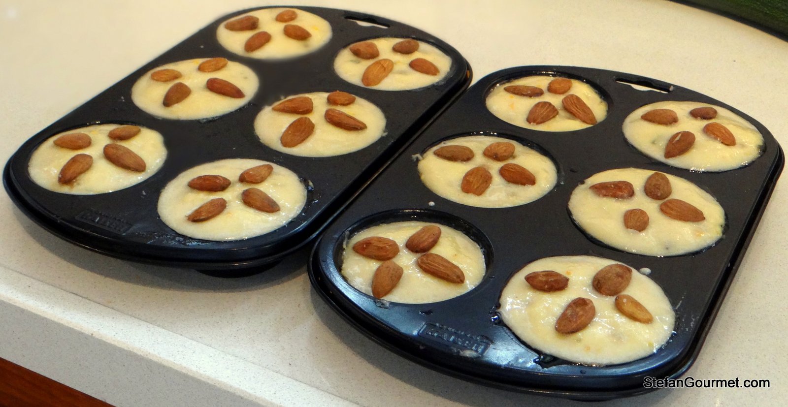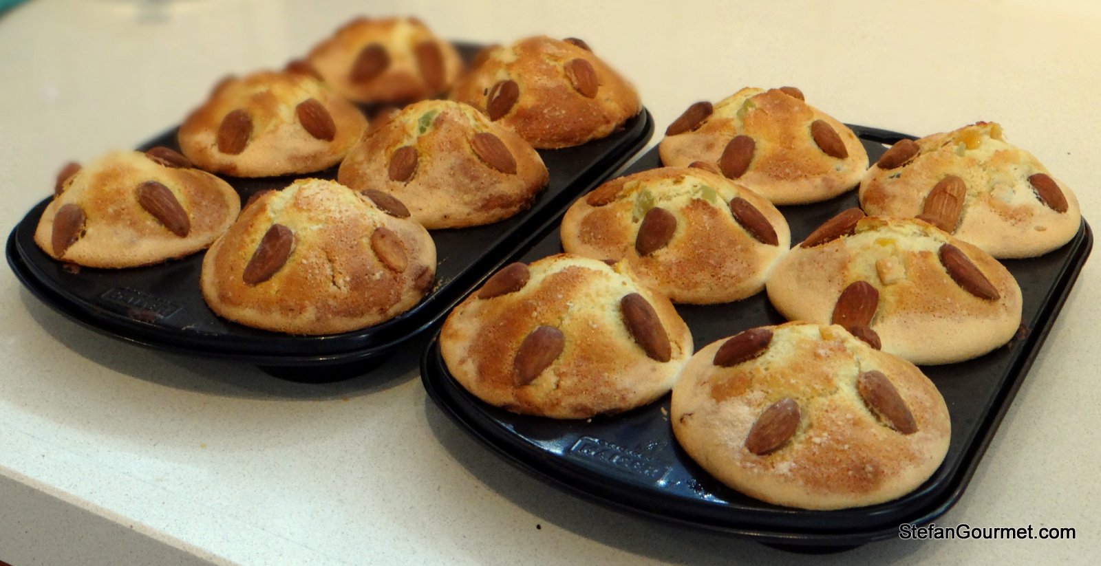 In Italy cardboard molds are sold before Easter for baking a colomba at home. I made the colomba for Easter dinner and I thought it would be nice to use a muffin tin instead. This makes for a nice presentation, even though it now certainly does not look like a dove anymore. These muffins turned out great, very soft and fragrant. I based the recipe on GialloZafferano, with some modifications. Of course you can also use the same recipe to make one big colomba if you have a suitable mold. You’d have to bake that for about 50 minutes at 160C/325F rather than the baking time and temperature indicated below. If you don’t like candied citrus peel, feel free to substitute by raisins (soaked and drained).