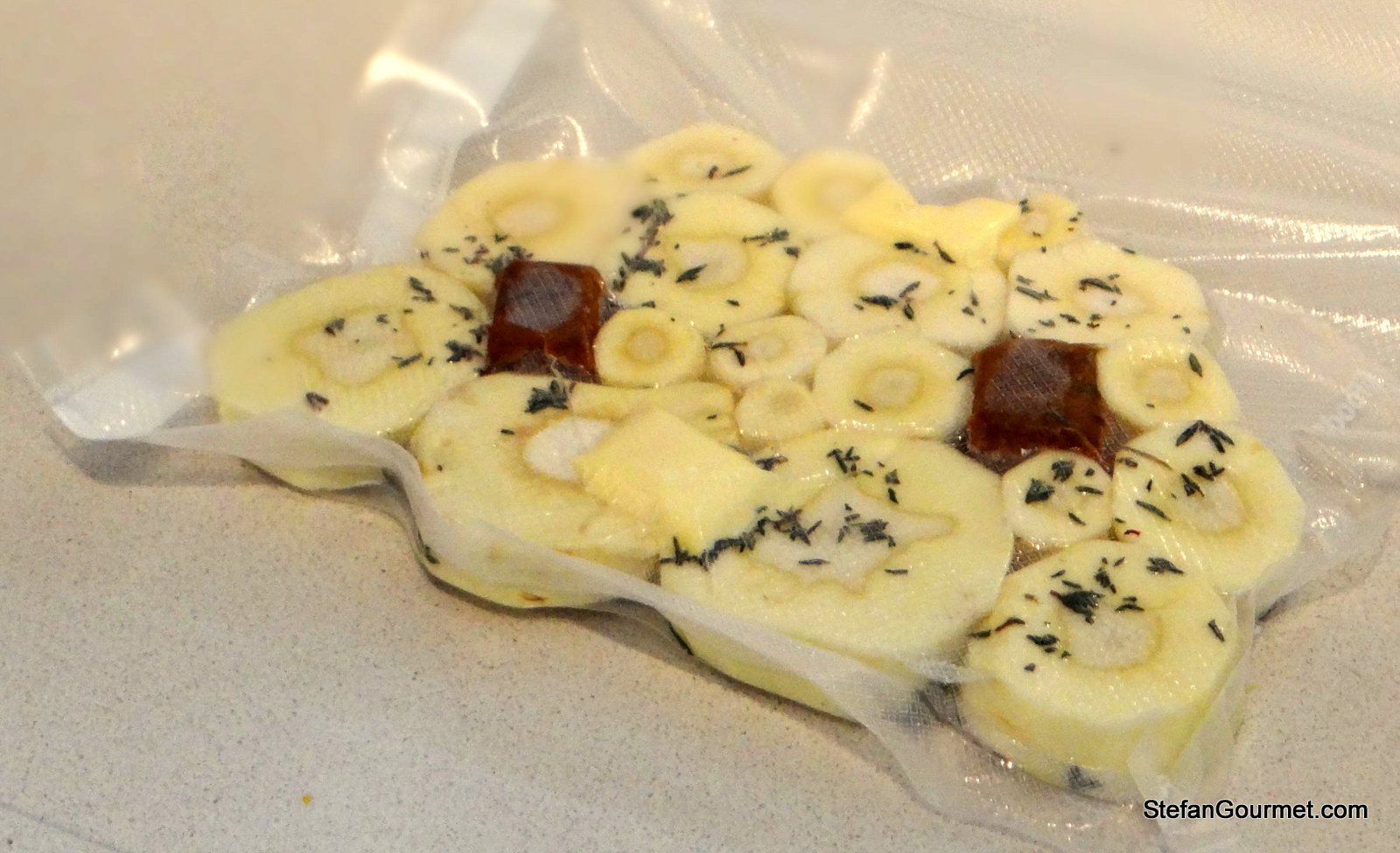 Vacuum seal the parsnip rounds with the stock and thyme.