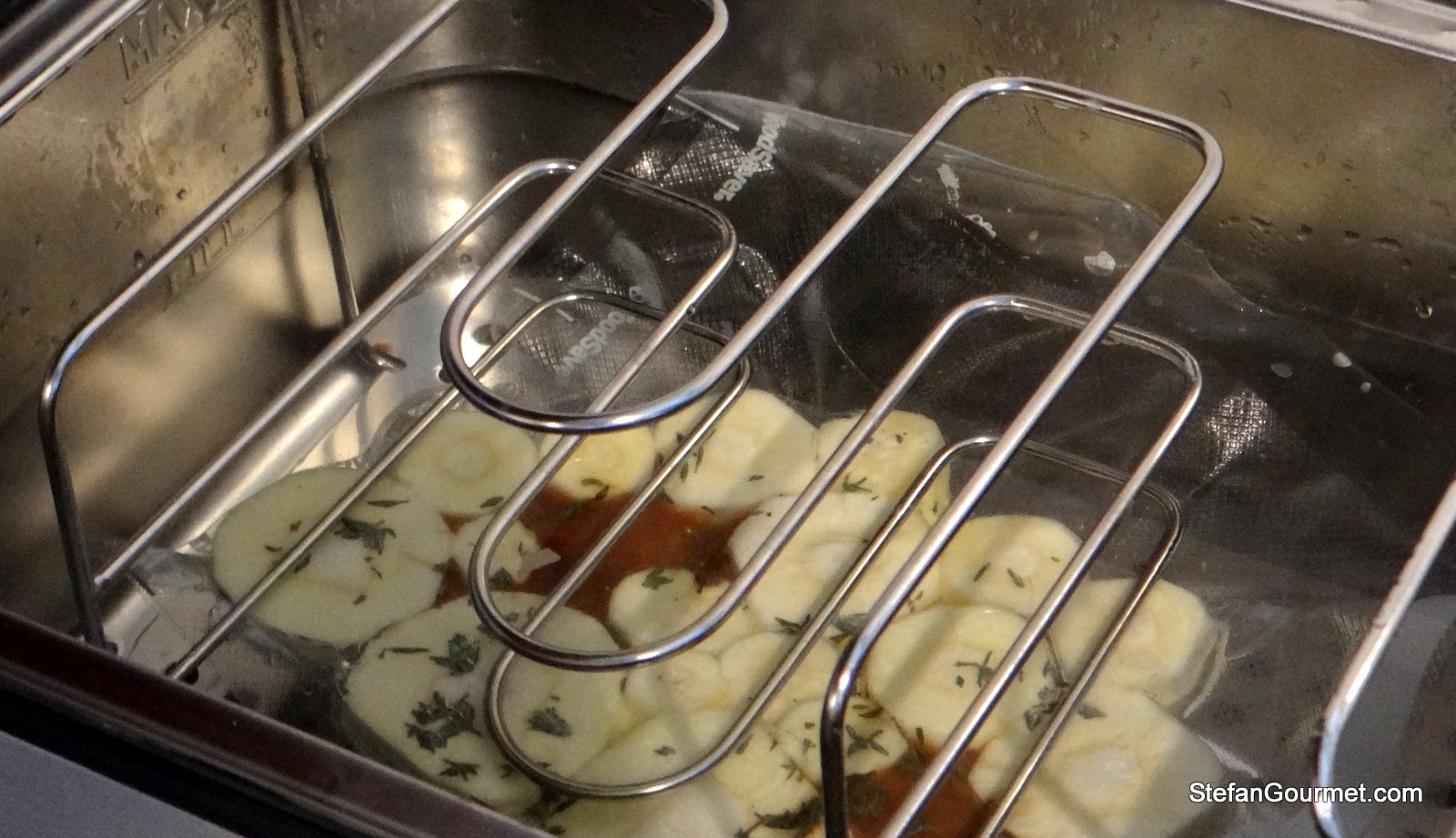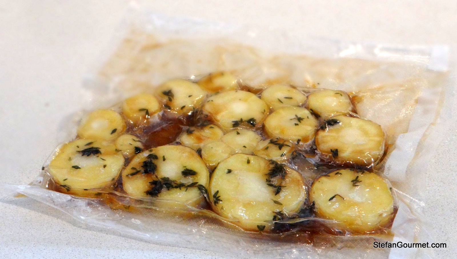 It can be cooked without sous-vide as well, but the nice thing about the sous-vide preparation that it is easier to cook the vegetables perfectly tender with some bite to them, neither undercooked or overcooked, and that you need less stock to cook them. With conventional cooking on the stove or in the oven, you’d need enough stock to almost cover the vegetables. With sous-vide you only need enough to coat them. If you don’t own a chamber vacuum sealer, you must freeze the stock in cubes or use ziploc pouches to be able to vacuum seal the vegetables with the stock.