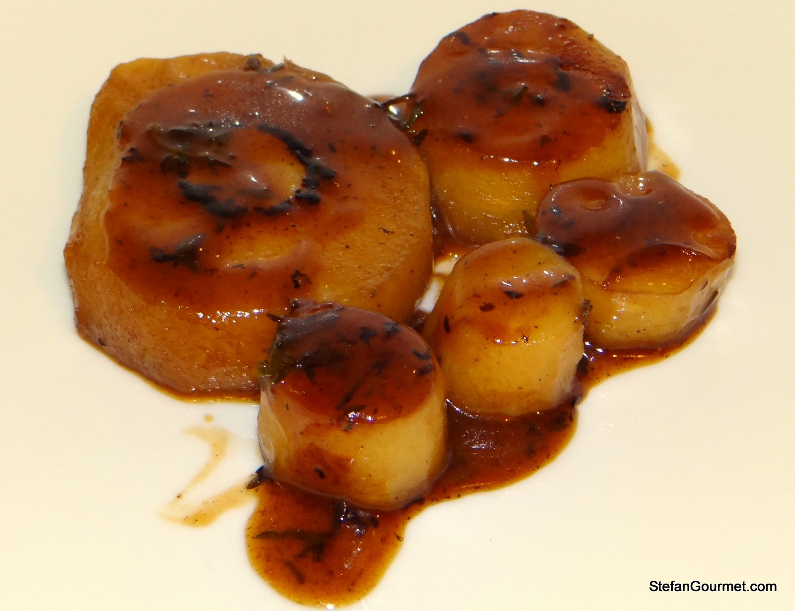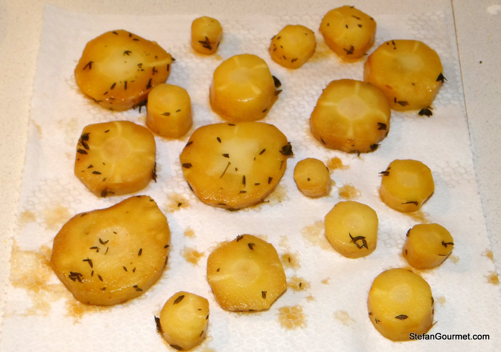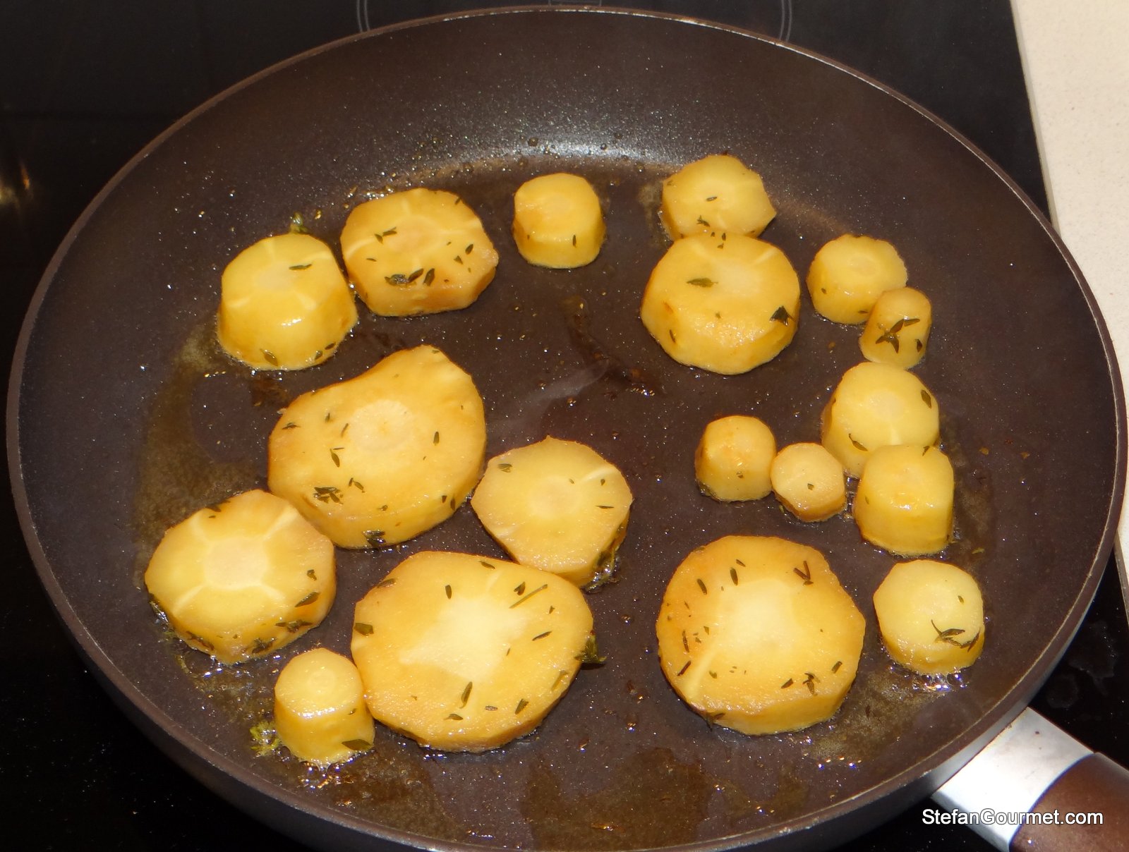 One of the ideas I got from my new ‘modernist’ friends is to prepare vegetable fondant sous-vide. I tried it with parsnips as a side for the lamb with our Easter dinner, and it turned out great. I had never heard of vegetable fondant, but it seems to be very popular in restaurants in the UK. Root vegetables or potatoes are browned in fat and subsequently cooked in stock. It is relatively simple to do, but quite tasty as both the stock and the browning will add some nice flavor to the vegetable. This technique can also be used for potatoes, celeriac, sweet potatoes, carrots, etc.