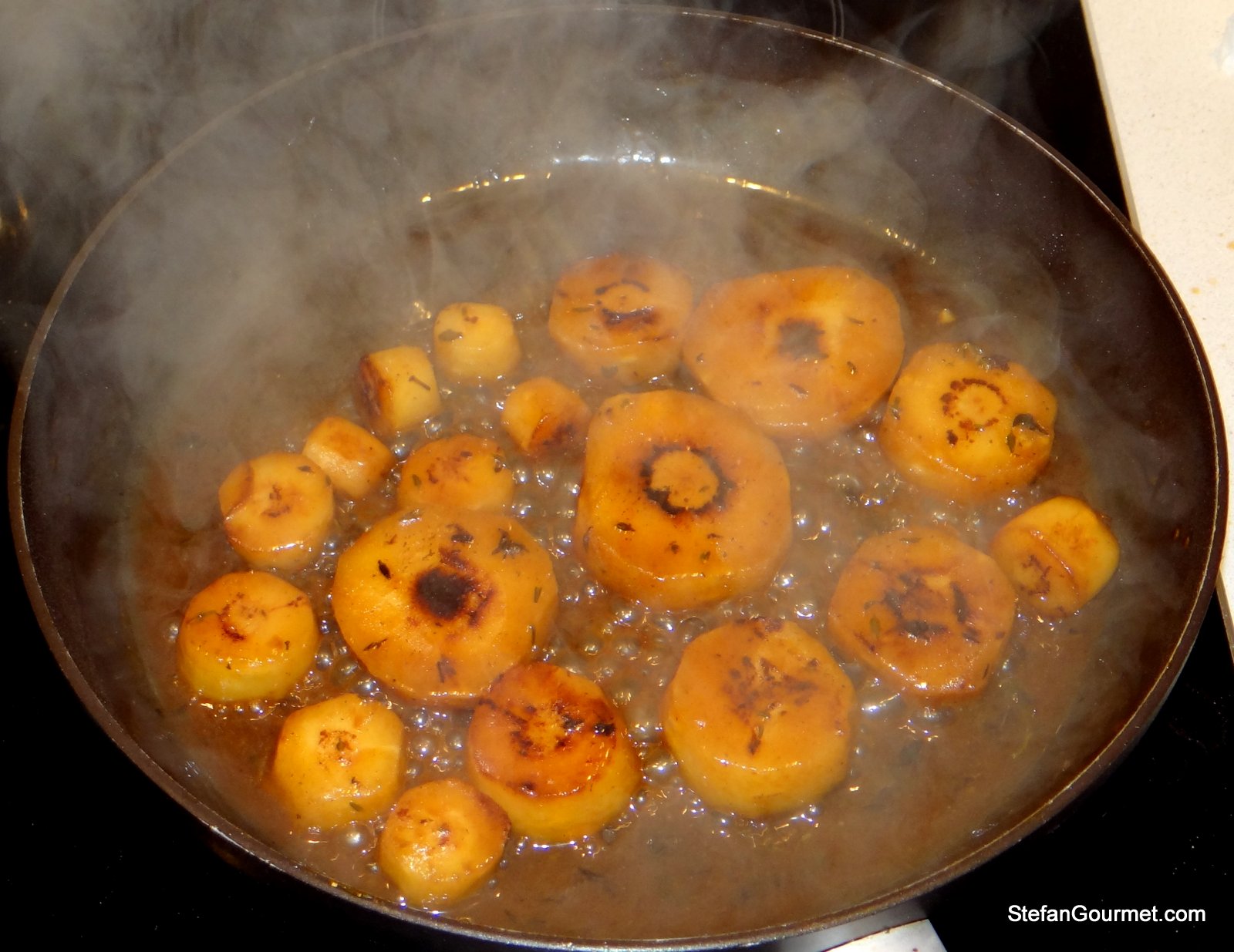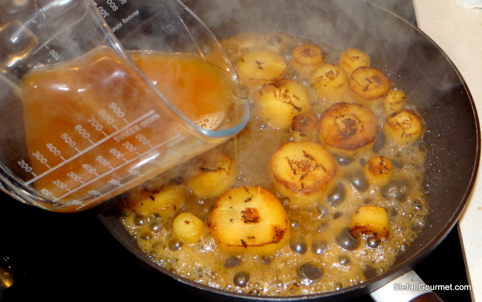 If you’d like to serve them crispy, remove them from the pan. Deglaze the pan with the reserved juices from the bag, diluted with some water.