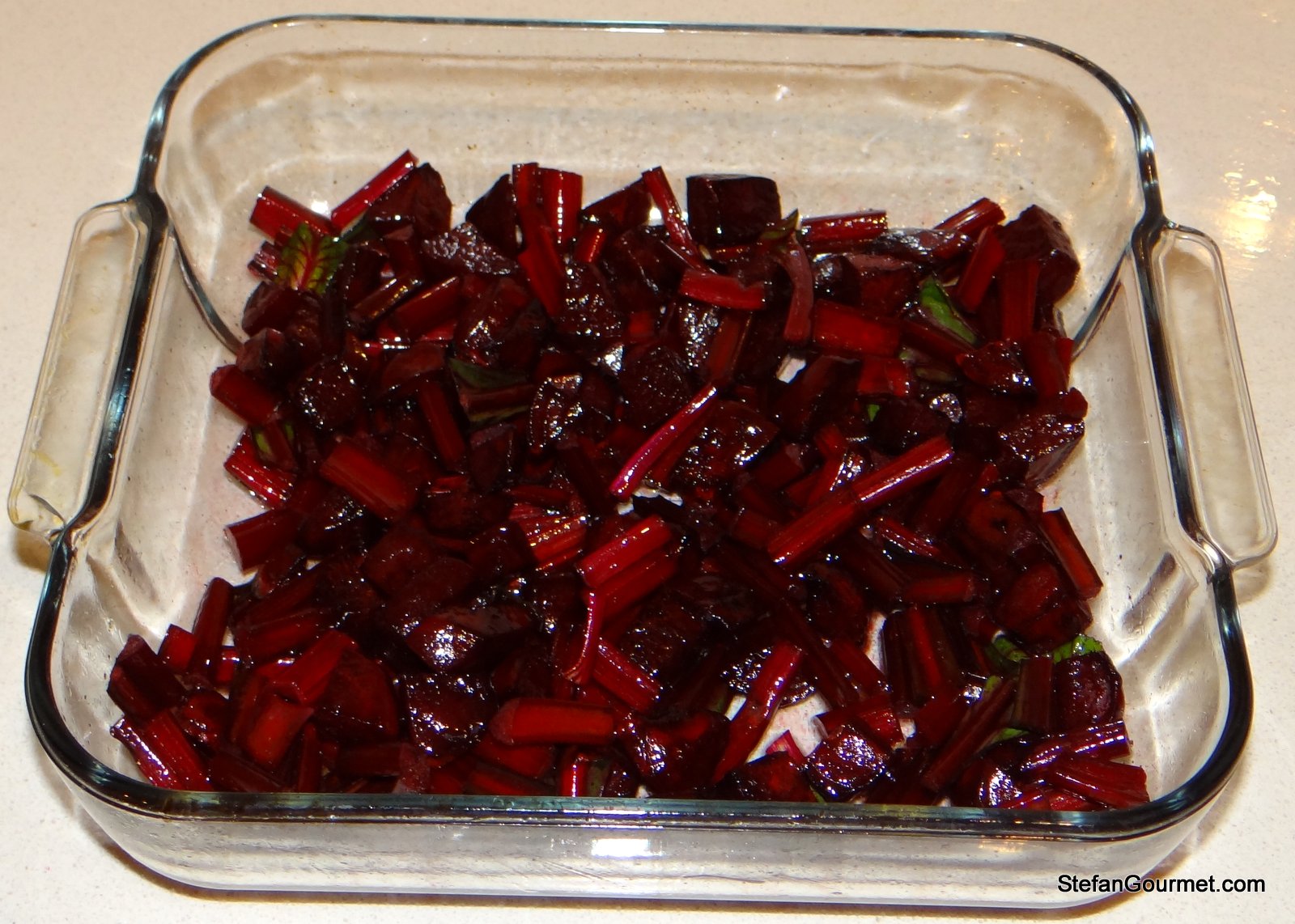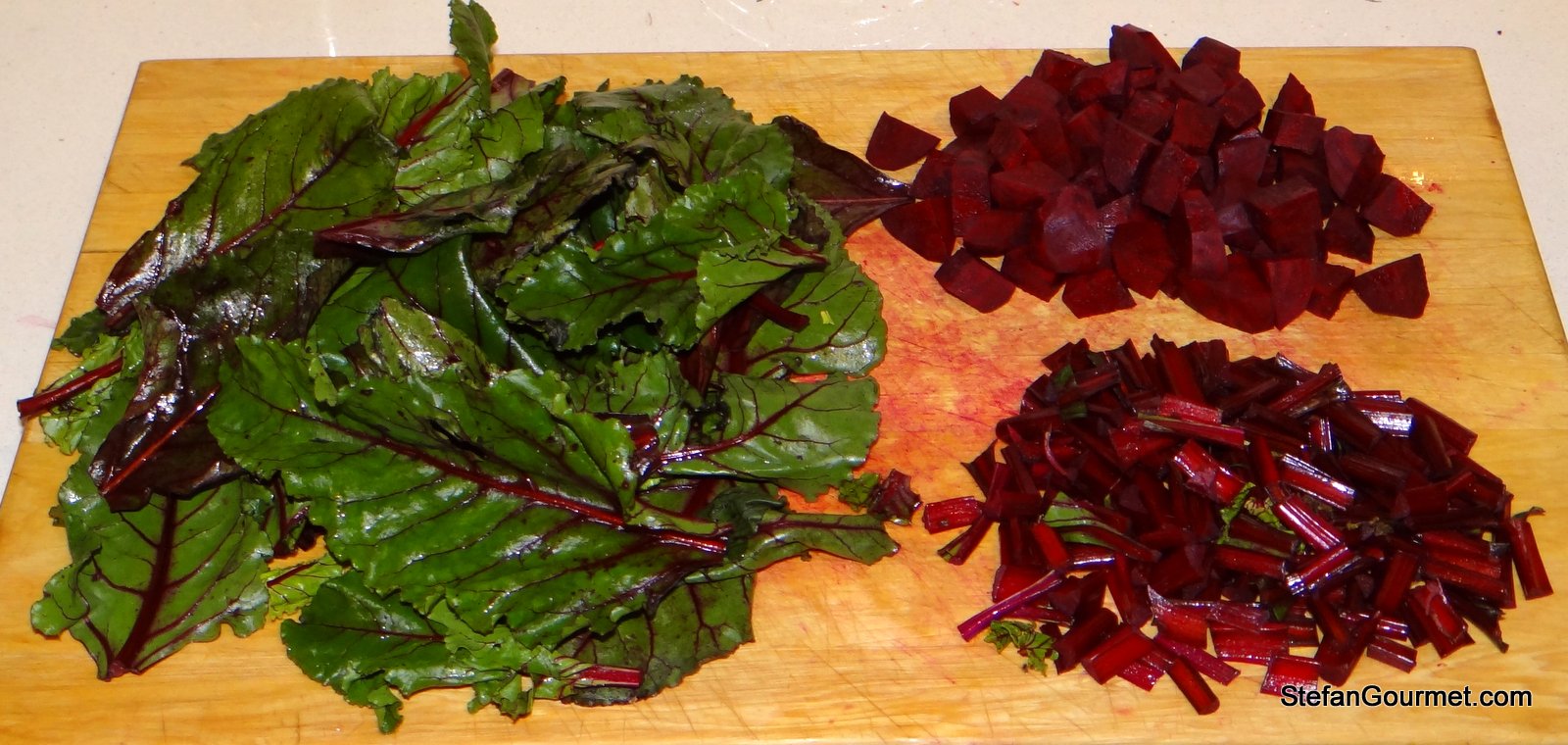 Peel the beetroots and cut them into cubes (about 1.5 cm/.5 inch). Wash the leaves and stalks. Cut up the stalks into 2.5 cm (1 inch) pieces. Roughly chop the leaves.