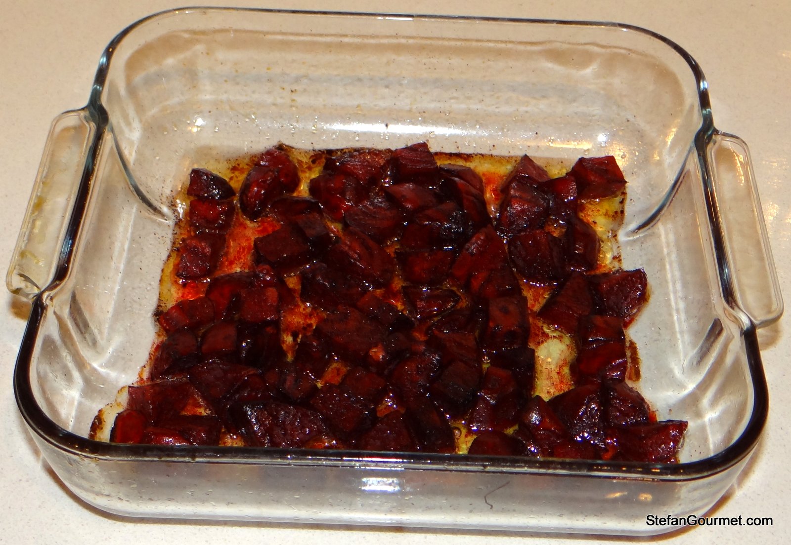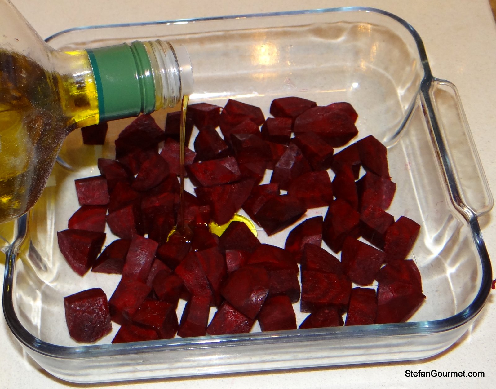 Preheat the oven to 225C/440F. Put the beetroots in an oven-proof dish and add the olive oil. Toss to coat the beetroot on all sides.