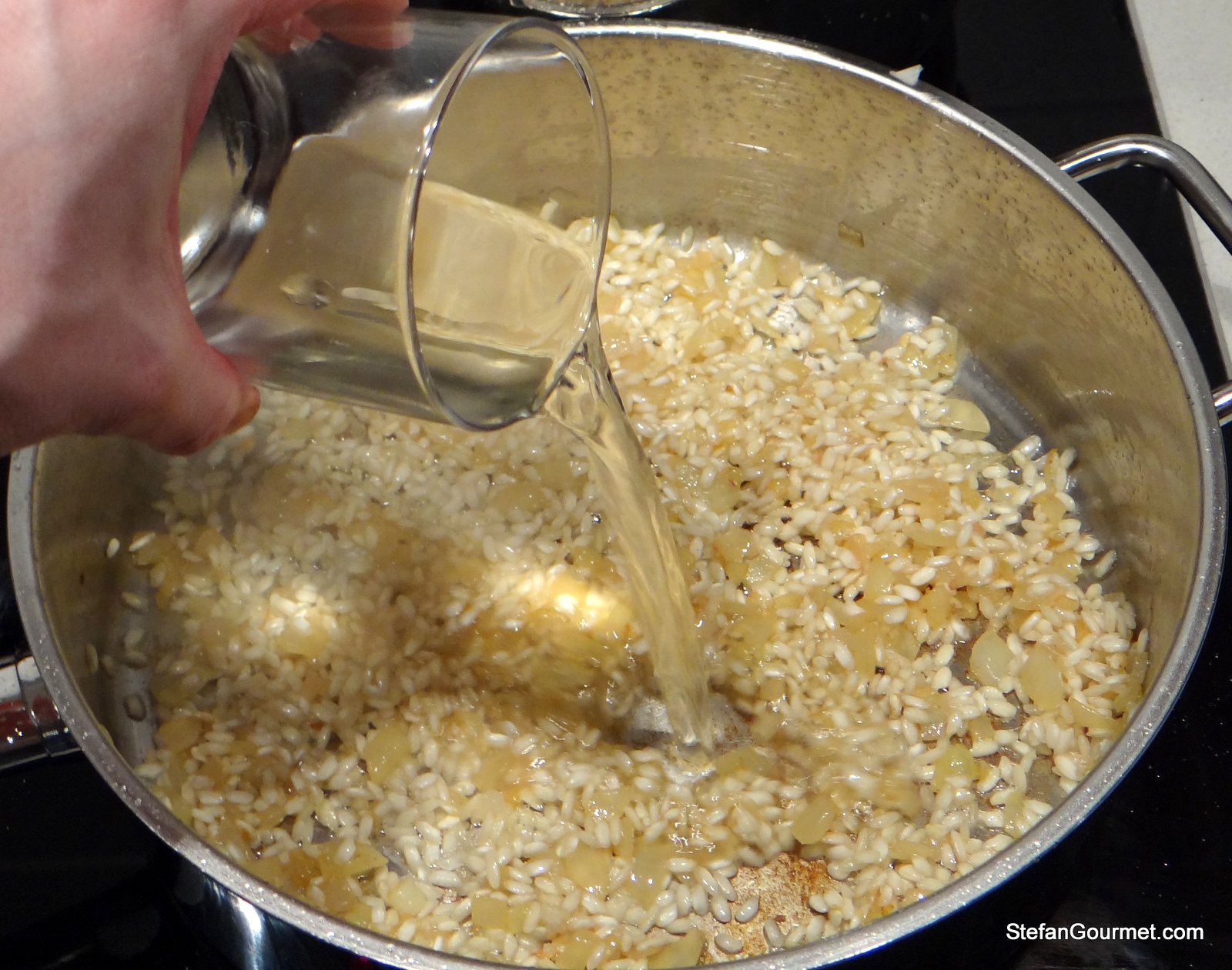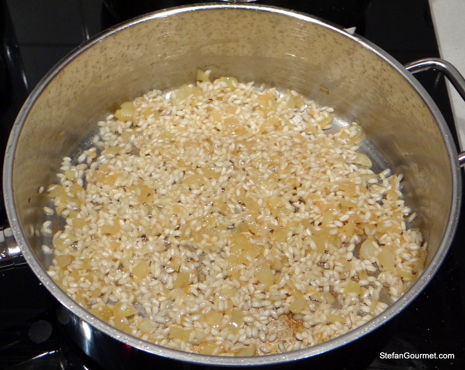 Heat 2 Tbsp butter in a thick-bottomed frying pan over medium heat. Add the onion and sauté a few minutes until the onion is translucent. Meanwhile, heat the stock and keep it simmering.