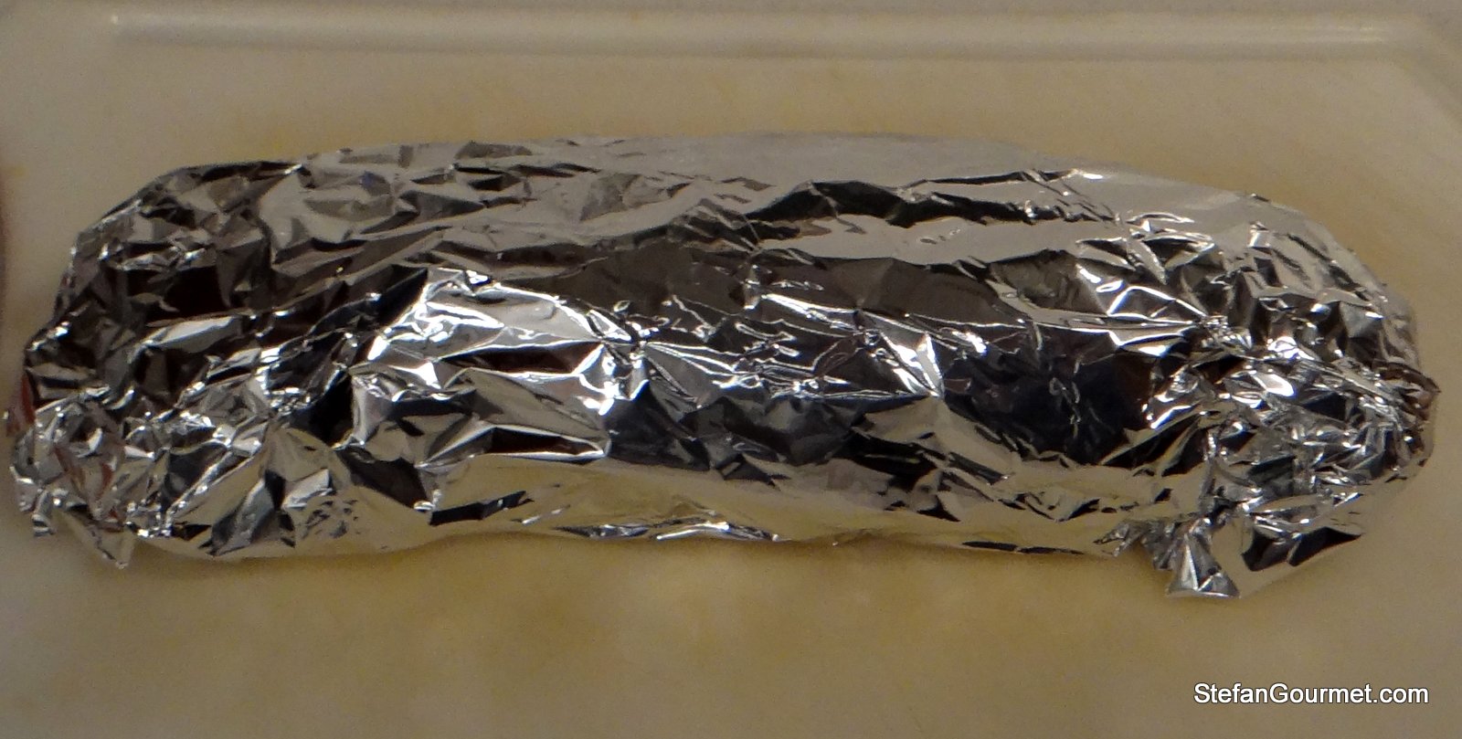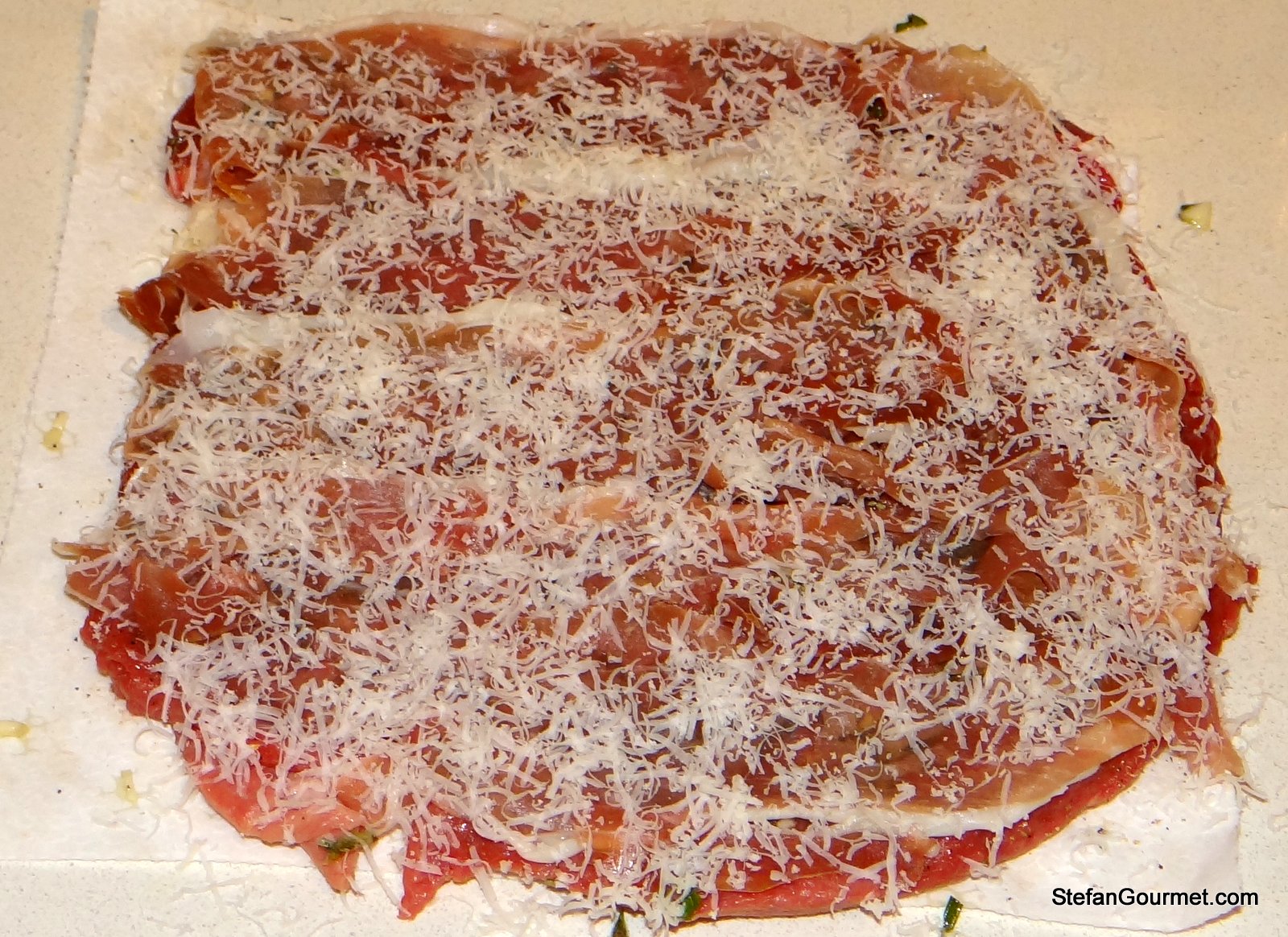 The one drawback of this dish is that beef tenderloin is expensive. Here in the Netherlands the price of brisket (“puntborst”) is only about a quarter of the price of beef tenderloin (“ossenhaas”). Apart from a longer cooking time (48 hours at 57C/135F), the preparation is identical to a preparation with beef tenderloin. The main point is that with sous-vide you can make Rosa di Parma either with beef tenderloin or brisket, whereas without sous-vide you can’t make Rosa di Parma from a brisket.