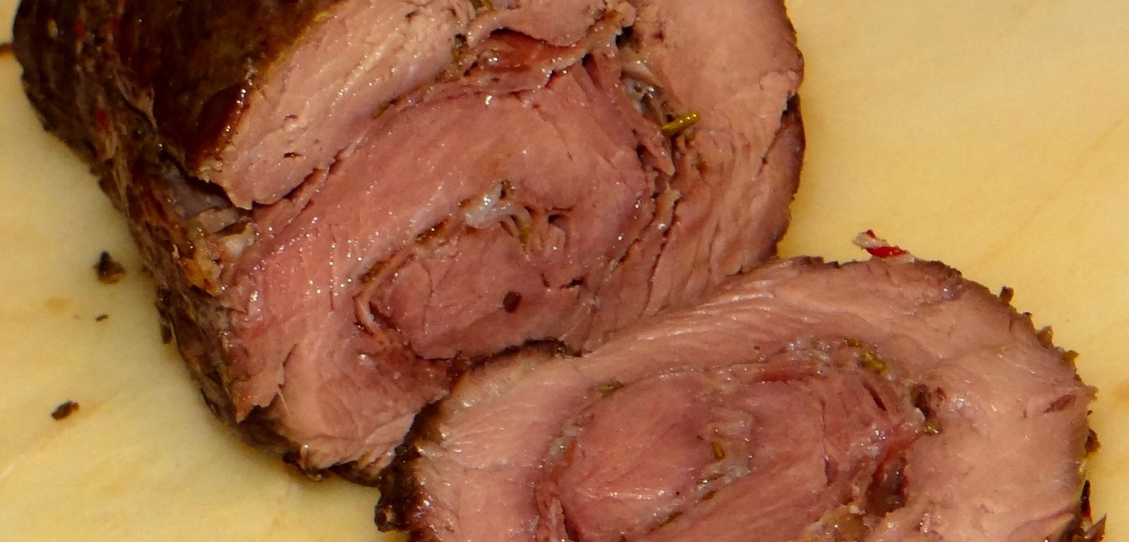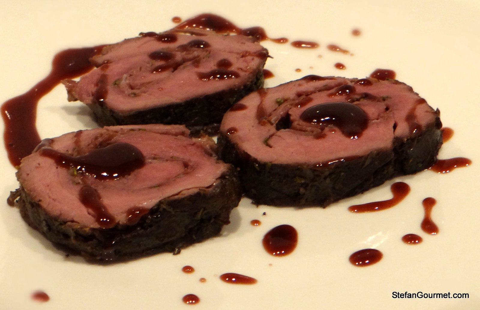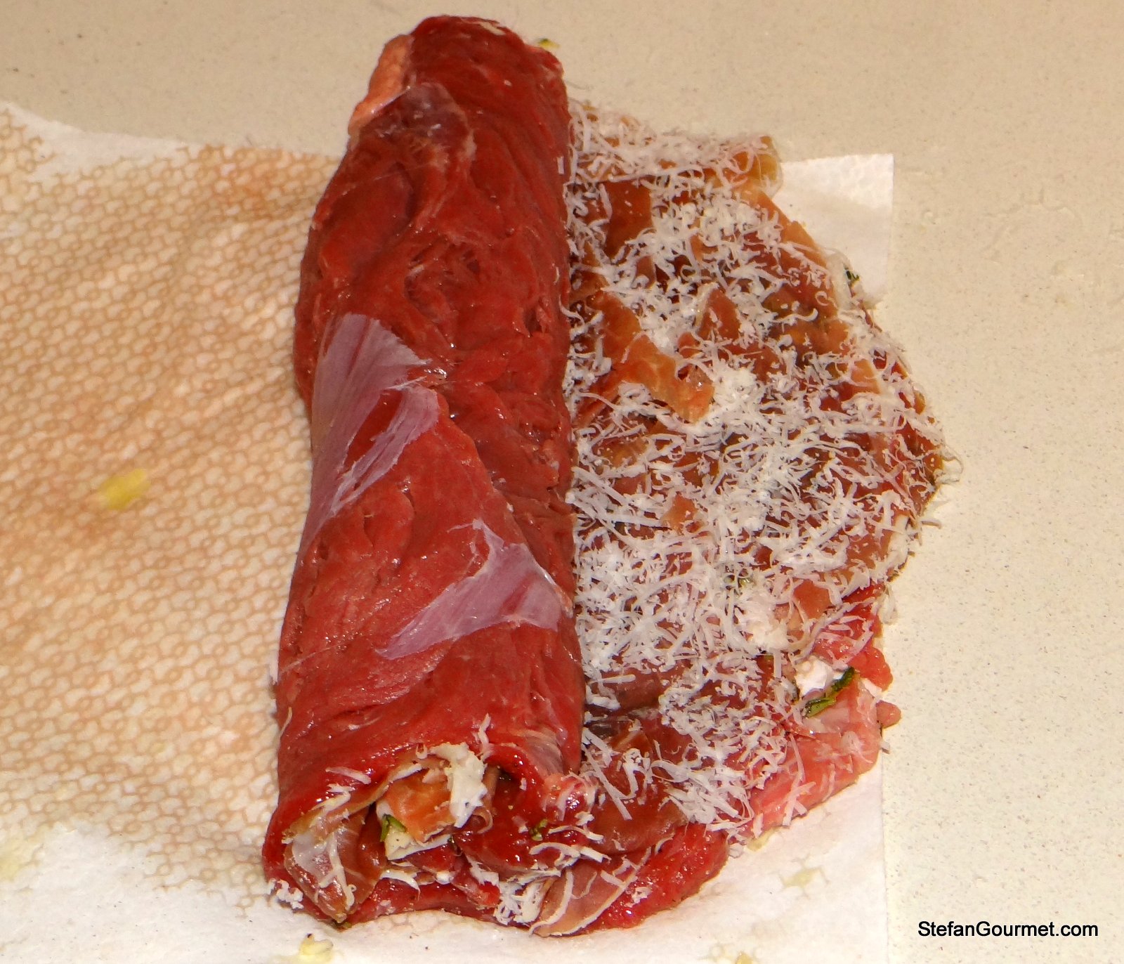 Roll the meat up tightly. Roll it up such that the slices you will be cutting from the roulade will be cut ‘against the grain’.
