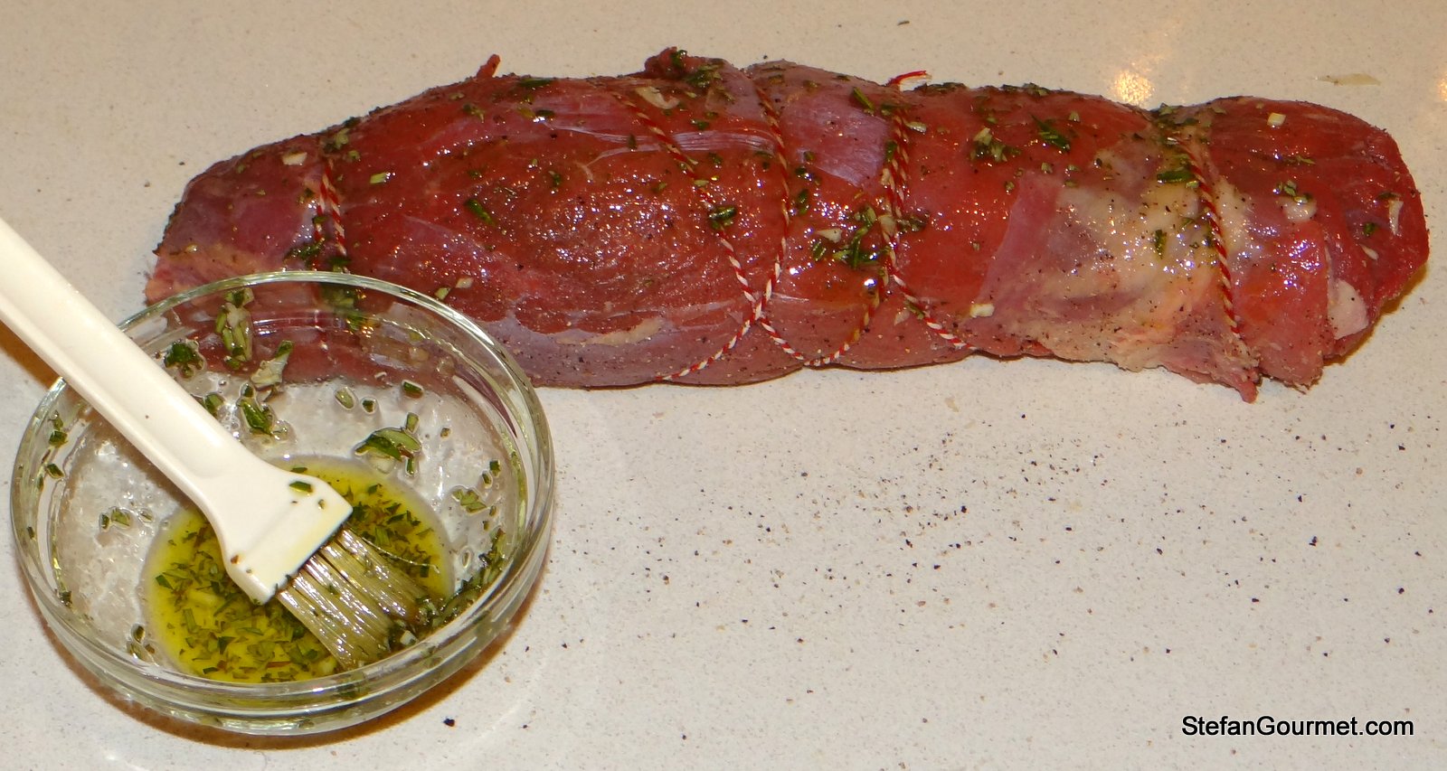 Mix the rosemary and garlic with 2 Tbsp extra virgin olive oil. Rub the meat with about 2/3 of this mixture.