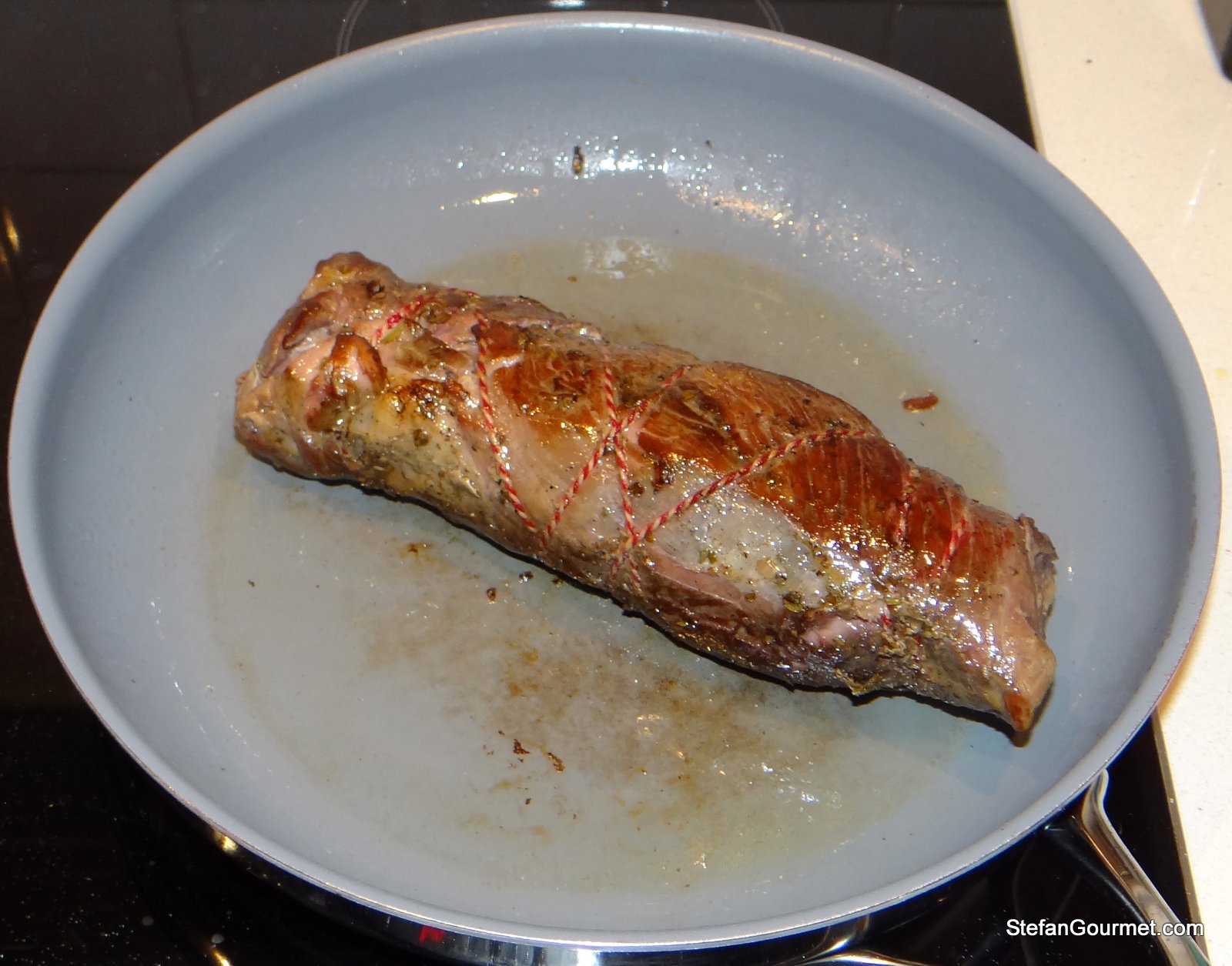 Brown the roulade quickly in a very hot frying pan with some clarified butter or olive oil. Clarified butter gives better browning without the splashing. The meat is already cooked through, so only cook it very briefly to give it some color and flavor.