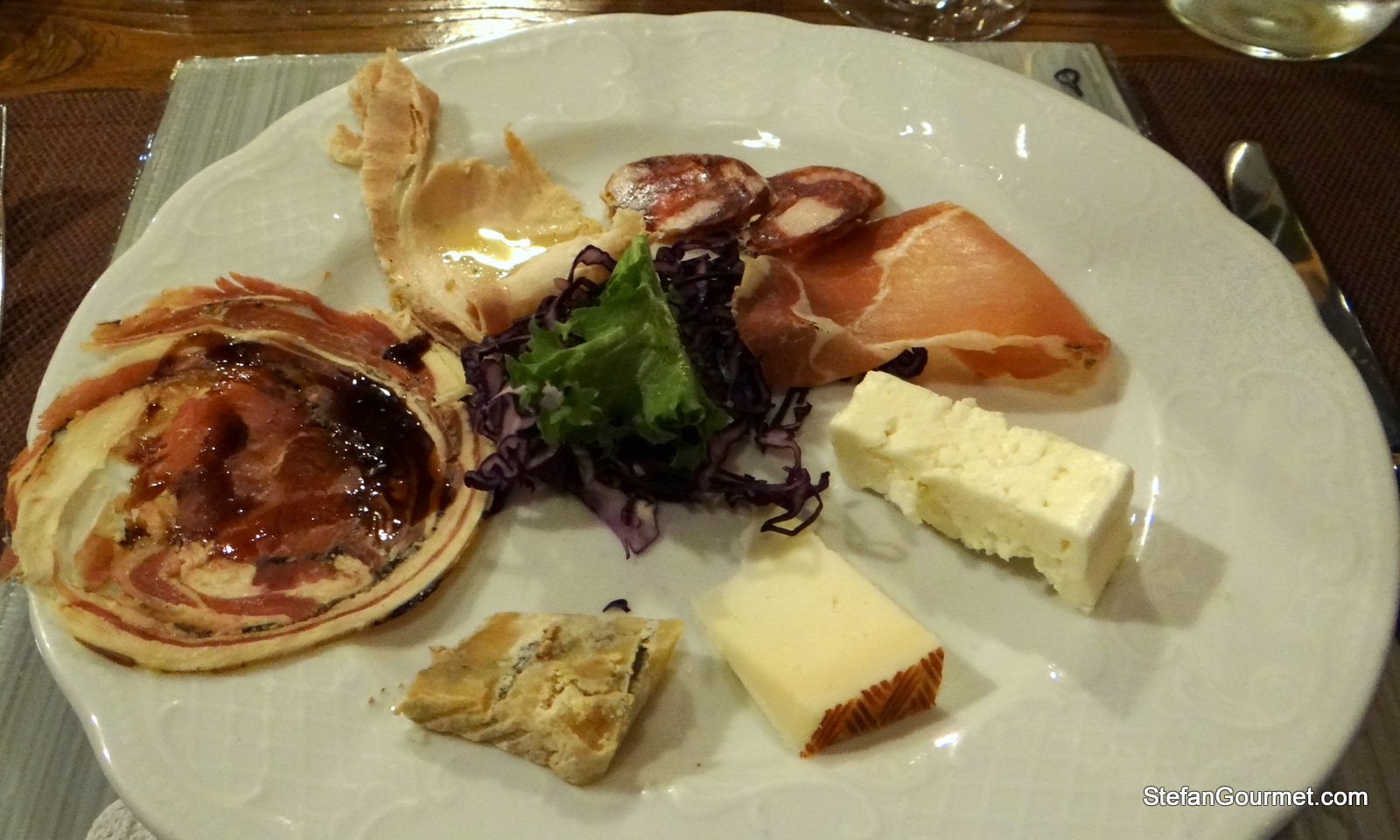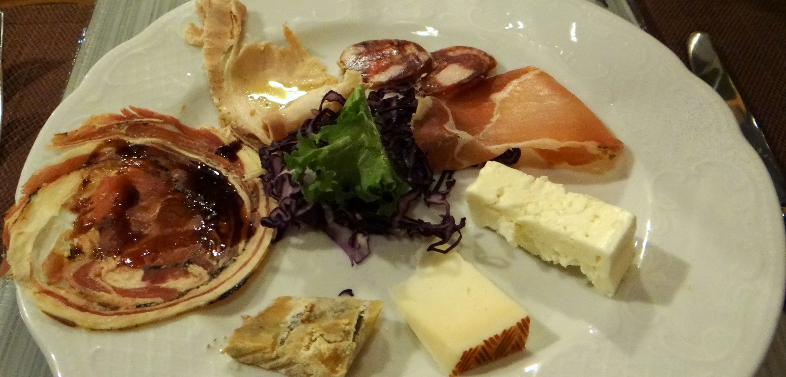 The cold antipasti consisted of lamb prosciutto, a cold cut of the local ‘black pork’, a dry sausage of the same, and cured coppa of the same, plus three types of goat cheese: young, matured, and blue. All of these were homemade and especially the lamb prosciutto was outstanding. 9/10