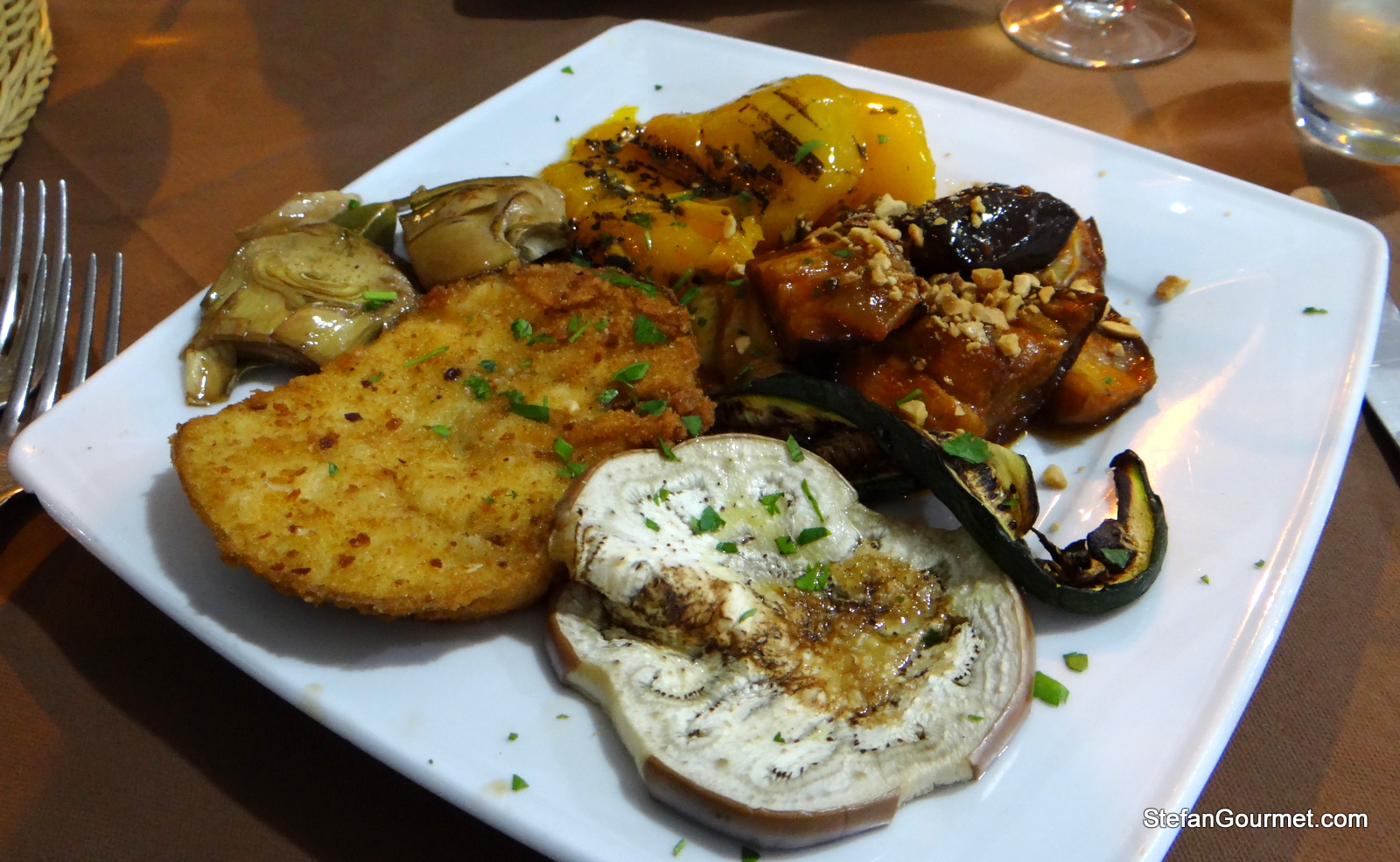 Mixed grilled vegetables: pink eggplant, breaded pink eggplant, zucchini, yellow bell pepper, marinated artichoke, and some caponata.