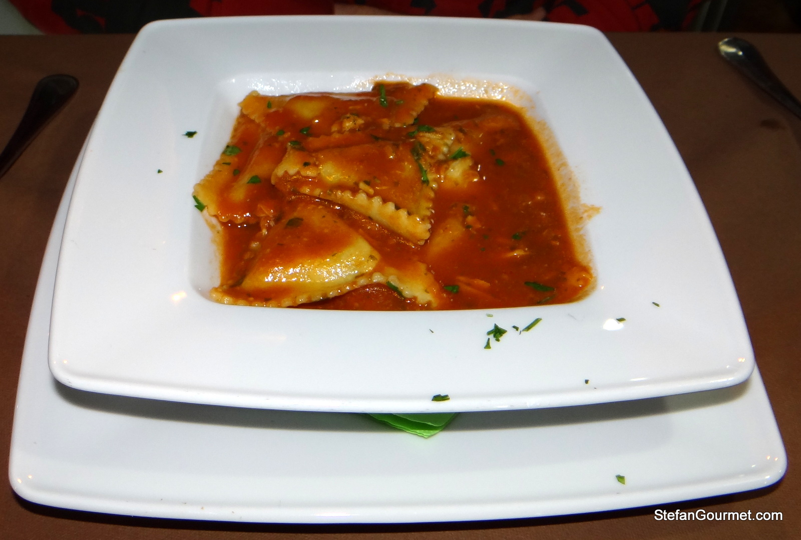 Ravioli in fish broth. Nice strong tomato-fish broth with delicate ravioli.