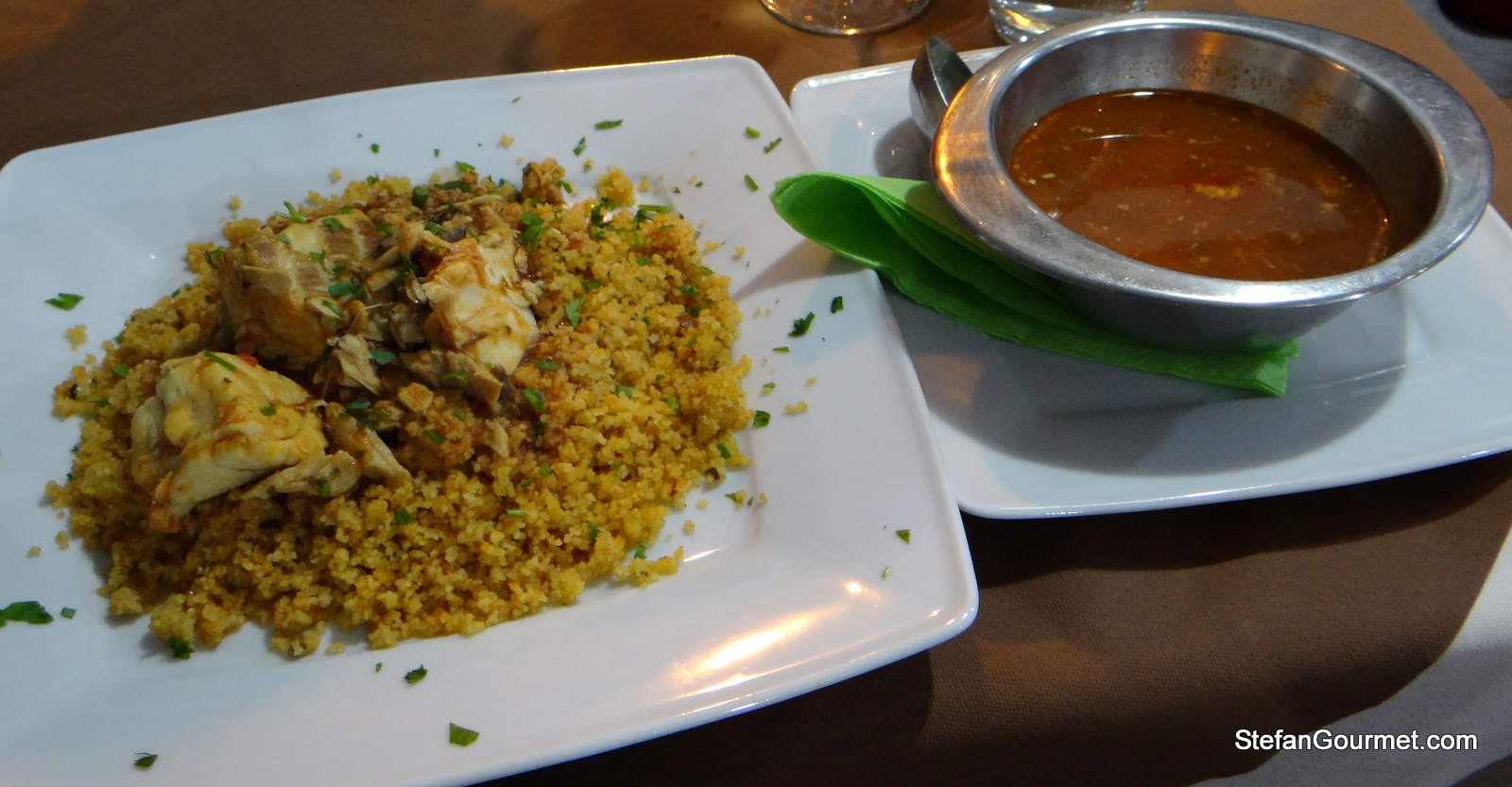 Cous cous with dentice (fish). Tomato-fish broth is served on the side so you can add as much as you like, and there are generous chunks of fish in the cous cous.