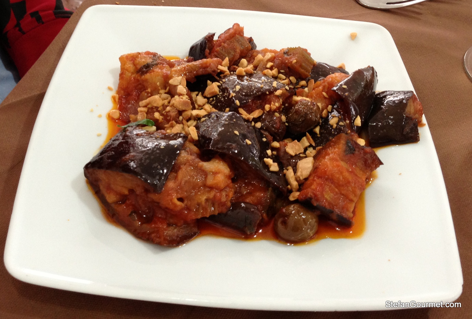 Caponata. Eggplant simmered in tomato sauce with olives and roasted almonds. The eggplant is very tender without falling apart completely. Lovely dish.