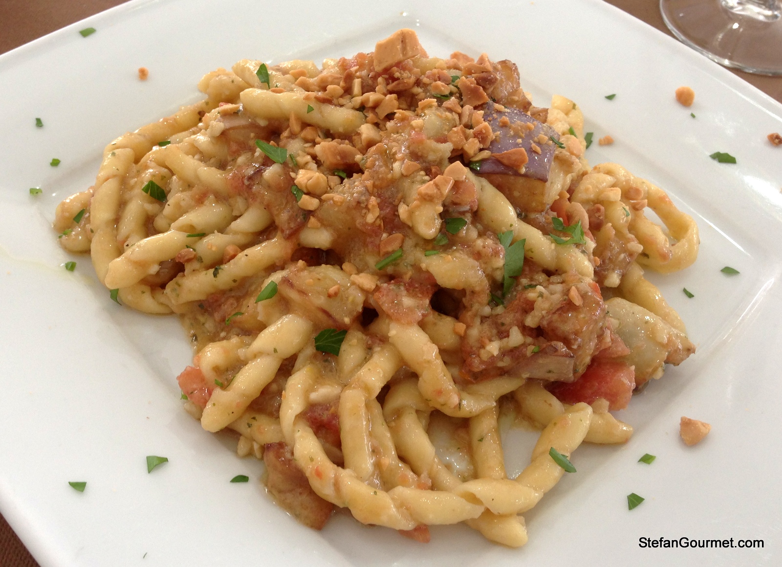 Busiate alla Trapanese. Busiate are the local fresh pasta shape, it’s like tagliatelle in a spiral. The local style is with fresh tomatoes, garlic, roasted almonds, and just a bit of pink eggplant. Very tasty.