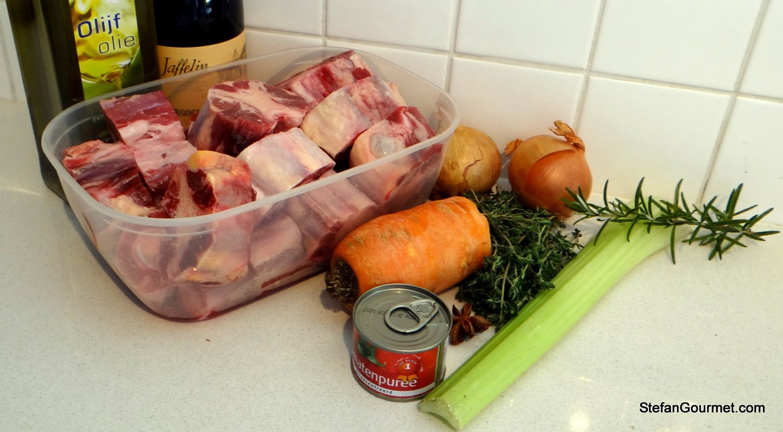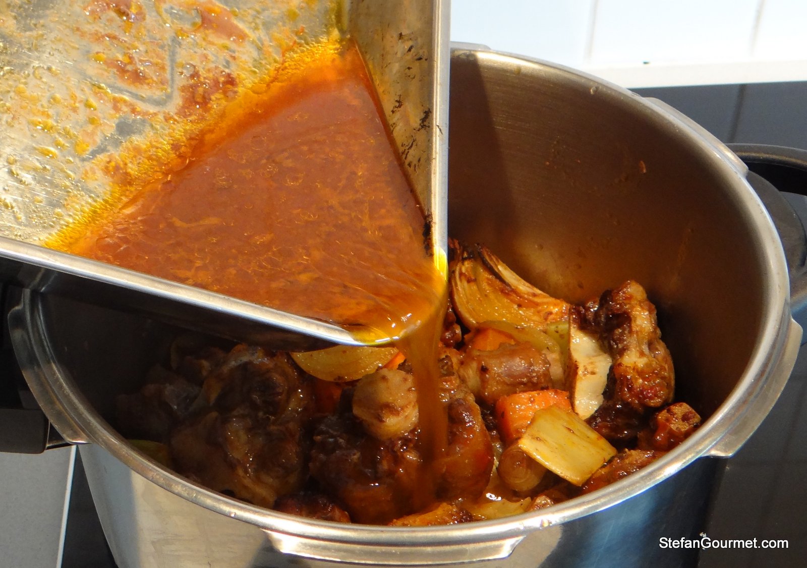 Home-made stock is an important success factor to many dishes and sauces. It is vastly superior to bouillon cubes and in most cases also better than anything else you can buy in a store. It’s not hard to make — it just takes a bit of time. After the success of pressure-cooked chicken stock I am a strong supporter of using a pressure cooker to make stock (with the most important reason more flavor, not the shorter cooking time), and so I also prepared this beef stock in my pressure cooker. You could however also prepare it in an ordinary pot and it will still turn out great.