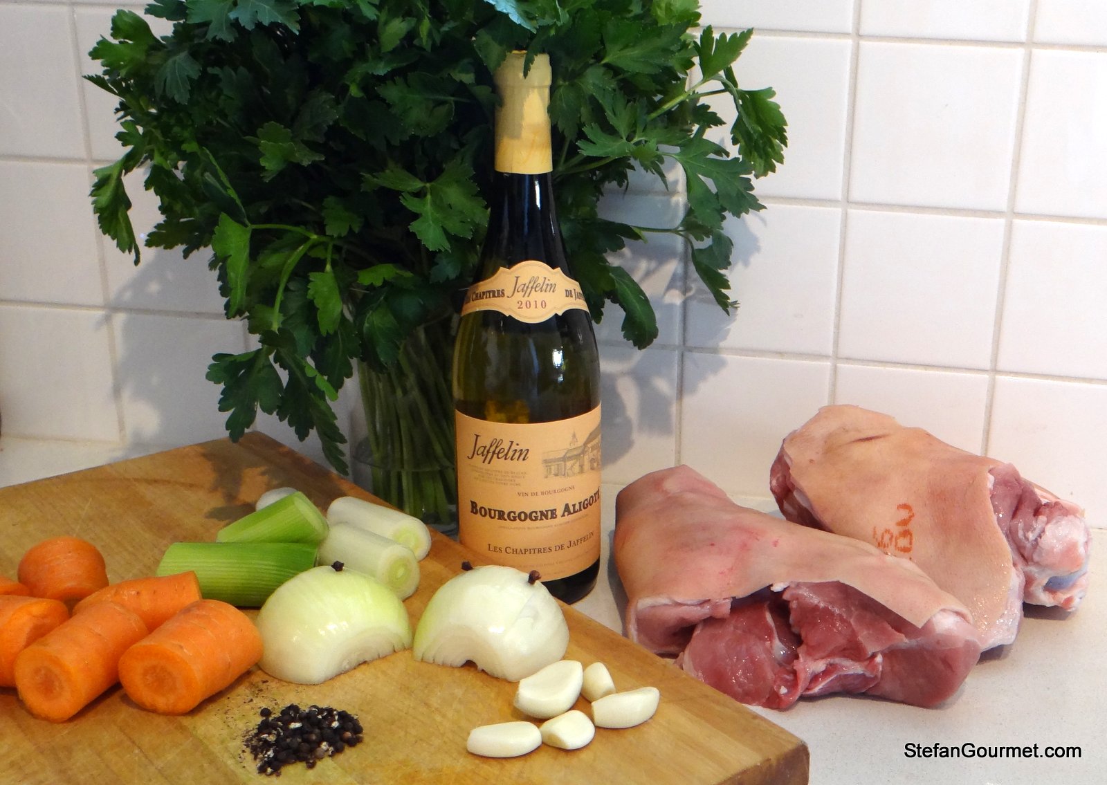 Jambon persillé is ham hocks simmered in aligoté (white wine from Burgundy) which is then turned into a terrine with parsley. In France the ham hocks are sold salted as palette de porc demi-sel, but I used fresh ham hocks. You could also add a pork’s foot (pork trotters), but my butcher had run out of them.