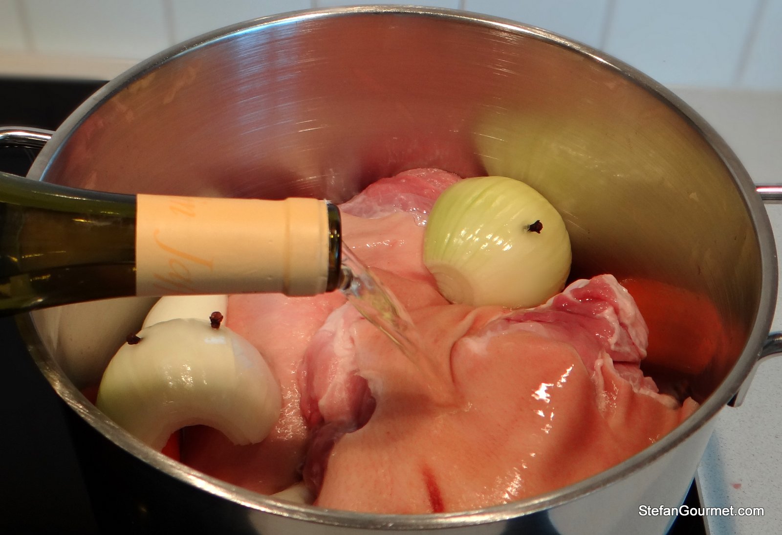 Discard the soaking water. Put the ham hocks in a stock pot with the onion, carrots, and leeks. Add the white wine.