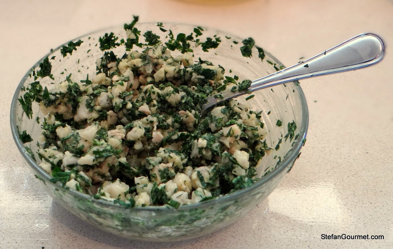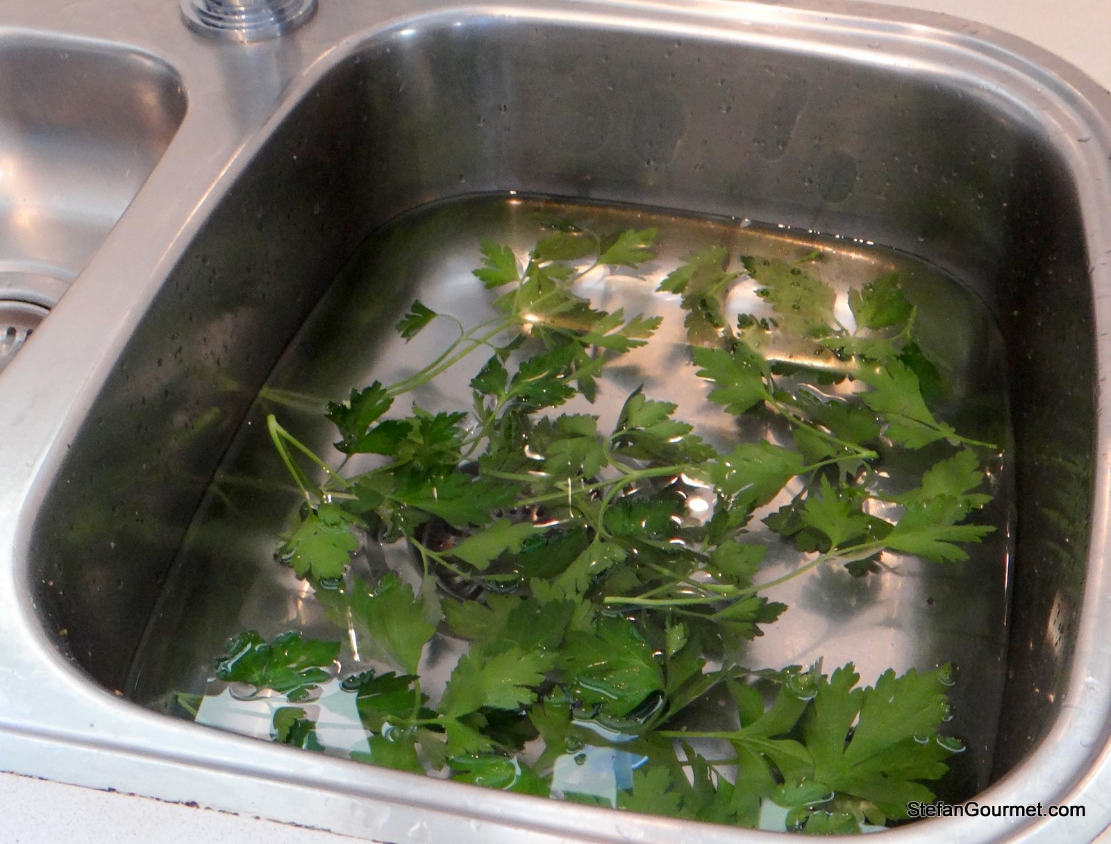 Meanwhile, let the parsley leaves from which you removed the stems soak in cold water to prevent them from drying out.