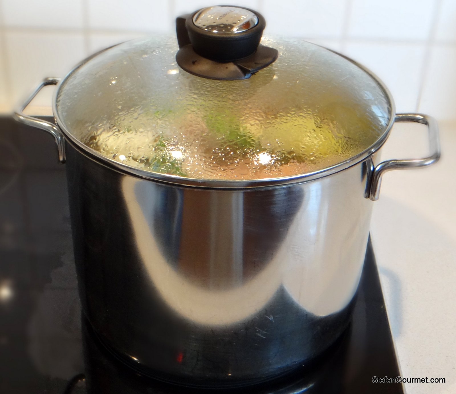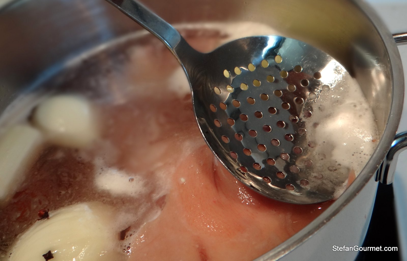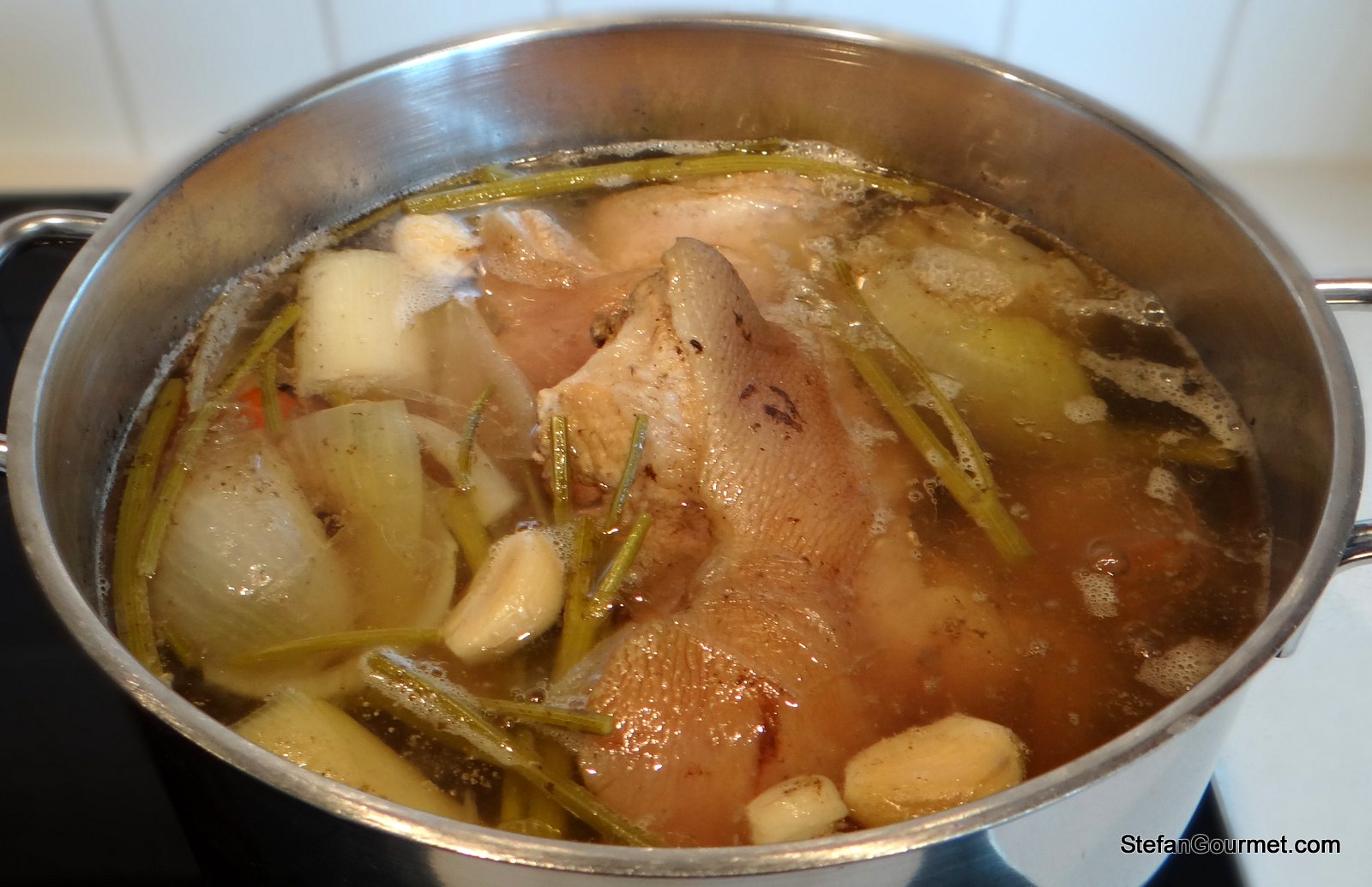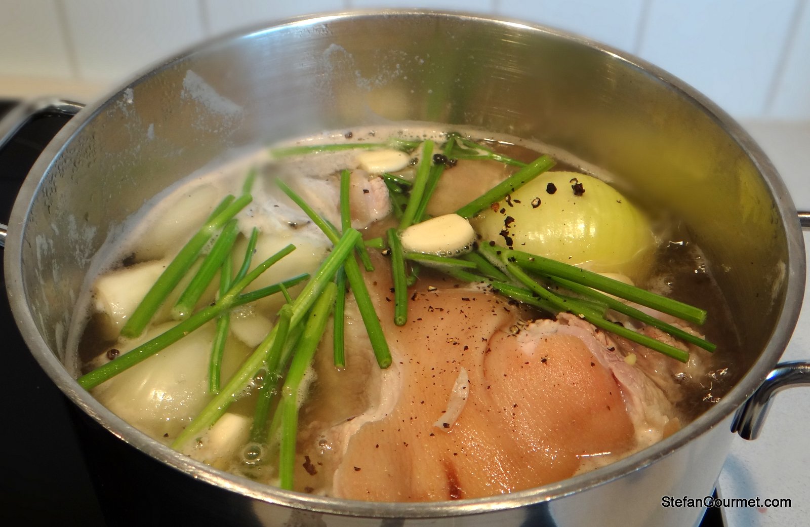 When all or at least most of the scum is gone, it’s a good time to add the reserved parsley stems, the garlic, and the pepper corns. It is a nuisance to skim with those ingredients already in the stock.