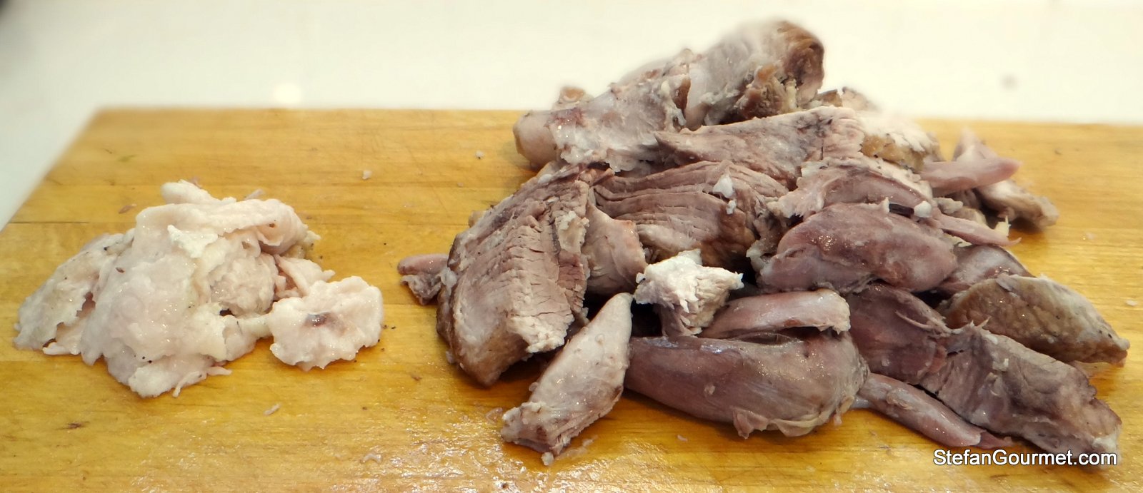 Take the meat off the bones. You can easily separate the muscle groups with your fingers. Carve the fat off the rind and discard the rind.