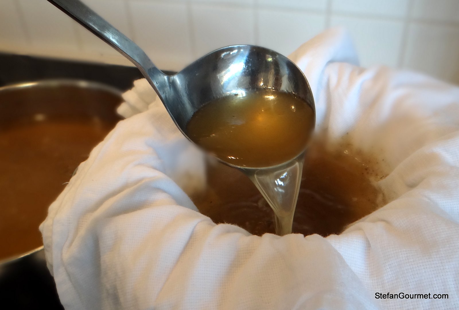 When the stock has been simmered down to the desired concentration, use a cheese cloth to filter it.