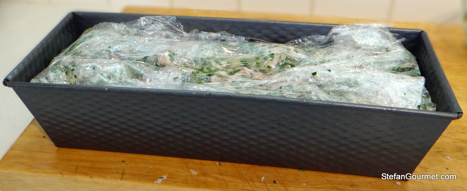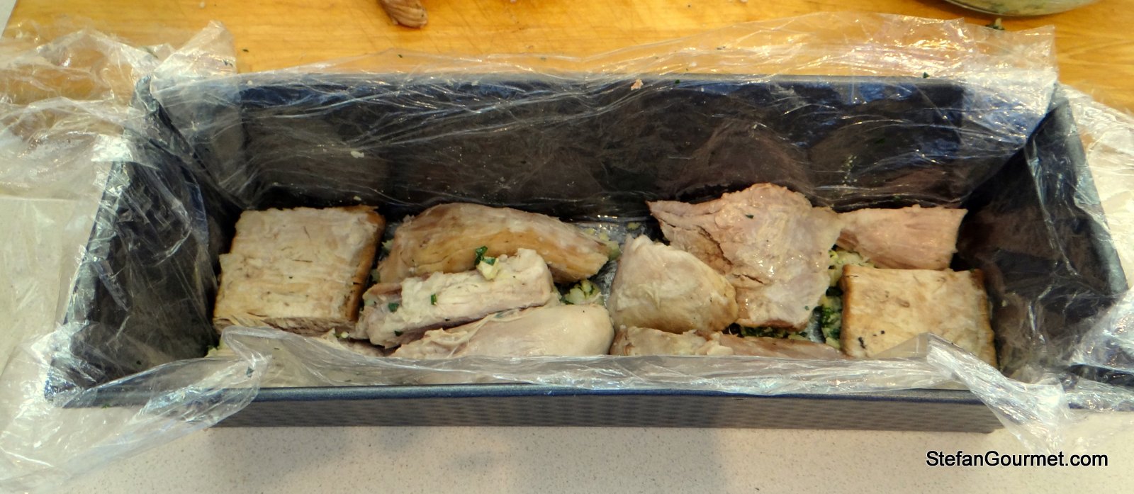The triple layer of plastic wrap makes it relatively easy to pull the terrine out of the mold.