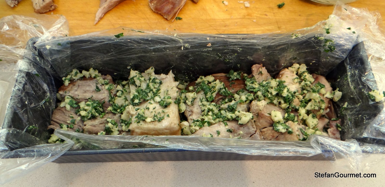 Add another layer of the parsley mixture. Keep adding meat and the parsley mixture until you have used up all the ingredients. Put the larger pieces of meat on the bottom and on the top, using the smaller ones for the middle. This will make it easier to cut the terrine.