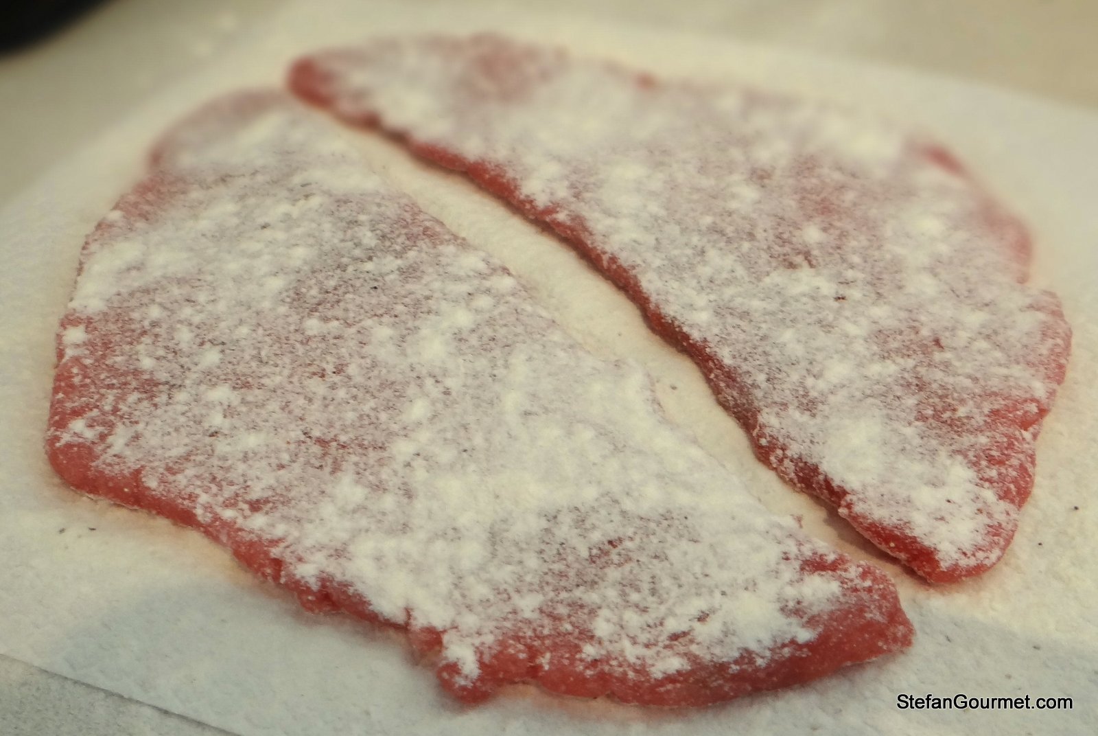 Dredge through flour on both sides, shaking off excess flour. I used Italian flour “improved for frying”, which means that it’s part rice flour. This will absorb less fat. Regular flour will do very well, too.
