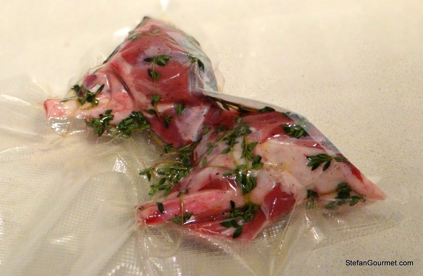 Stephan thanks for your inspiring sous vide features. I just prepared venison shanks for my anova model–the meat came from my hunting friends who enjoy challenging me with wild game. I did not use the raw herbs as the last time I included fresh herbs/veg my cooking bags got all puffy and smelly. Possibly from wild bacteria I never thot until you mentioned. Anyway I took a page from my brewing book and used a weak iodine solution to clean the meat surface and then rinsed off well. Cheers and Salud!