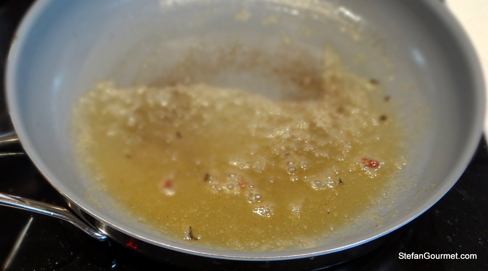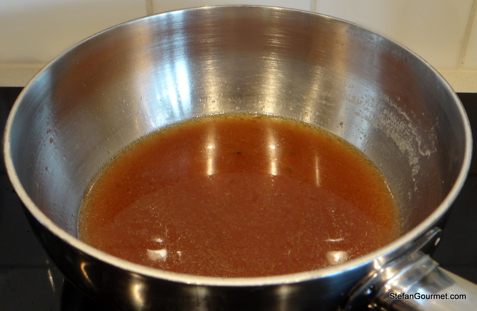 Put the lamb shanks on warm plates and deglaze the pan with the lamb juices obtained from the bag, using a wooden spatula to scrape any browned bits off the bottom of the pan. If you will be serving wine with the lamb, it’s also nice to add a bit of the same wine at this point. Allow the lamb juices (and the wine, if using) to reduce briefly over medium heat.