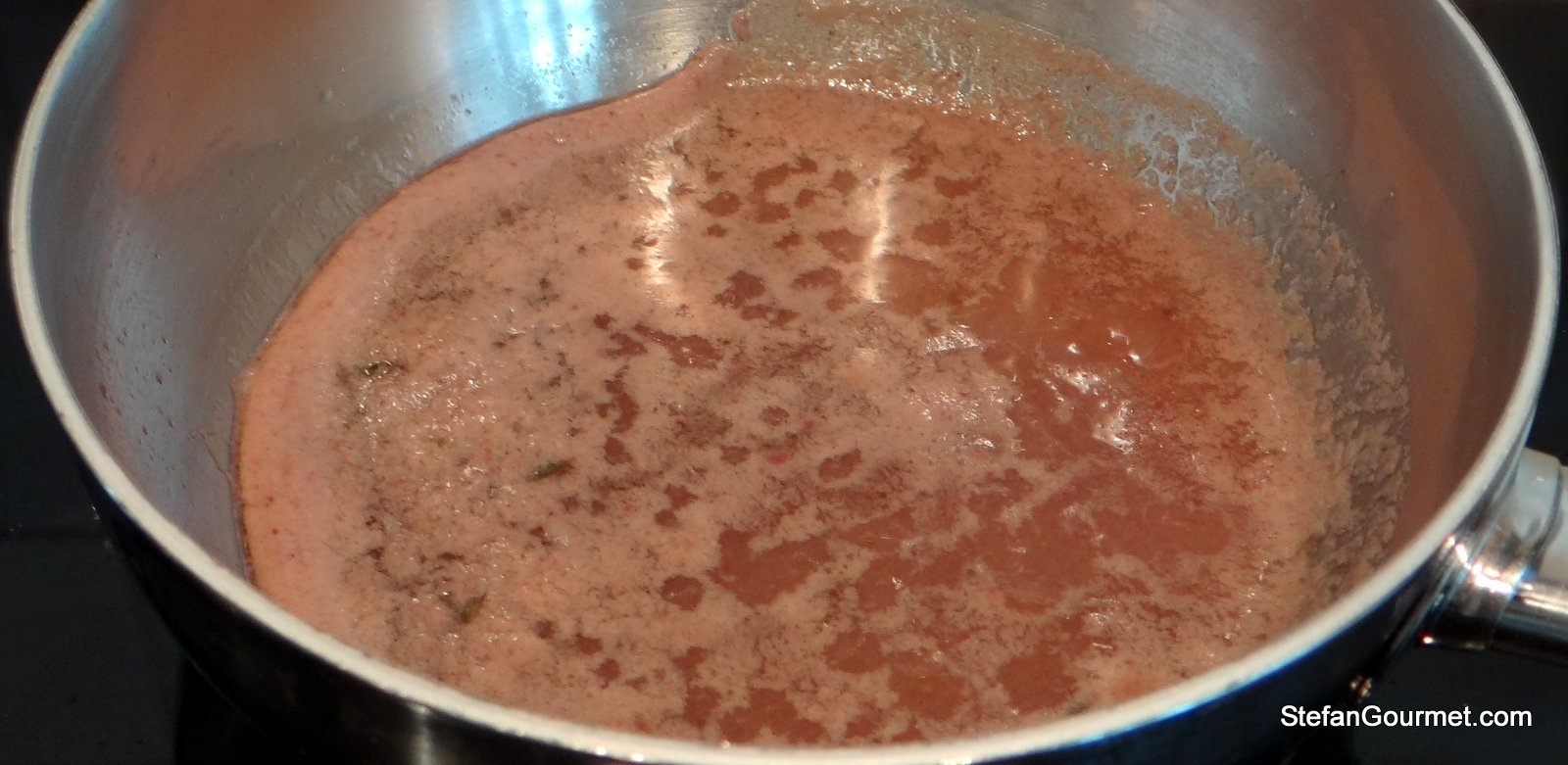 Bring to a boil and then lower the heat. Scum will form as the proteins in the juices have only been heated to 62C/144F during the sous-vide cooking and some of them will coagulate.