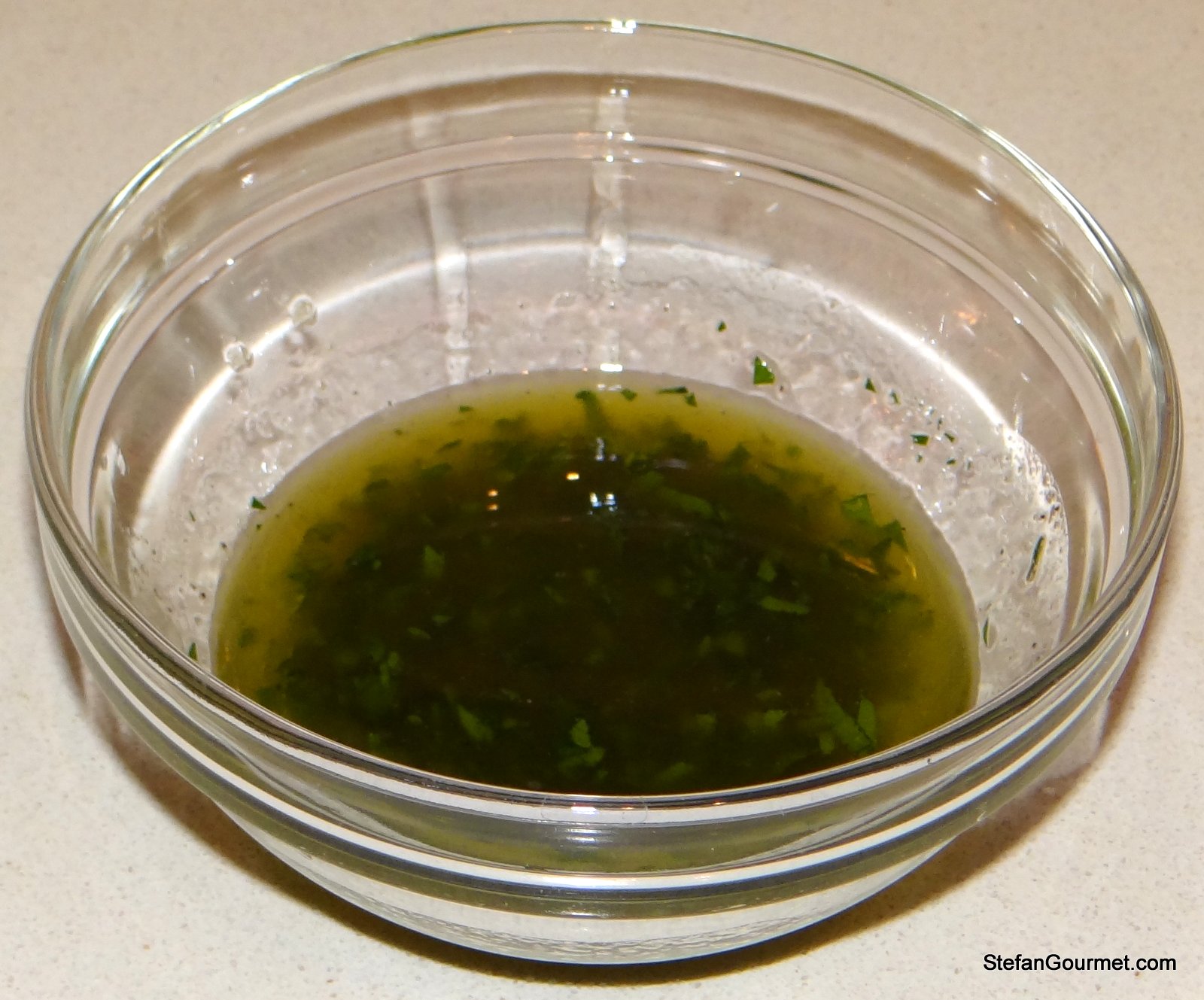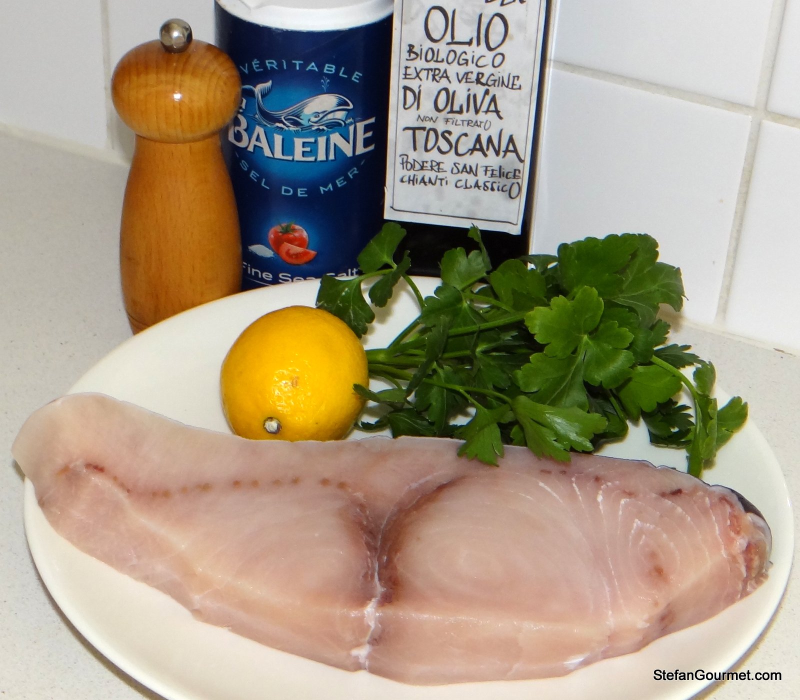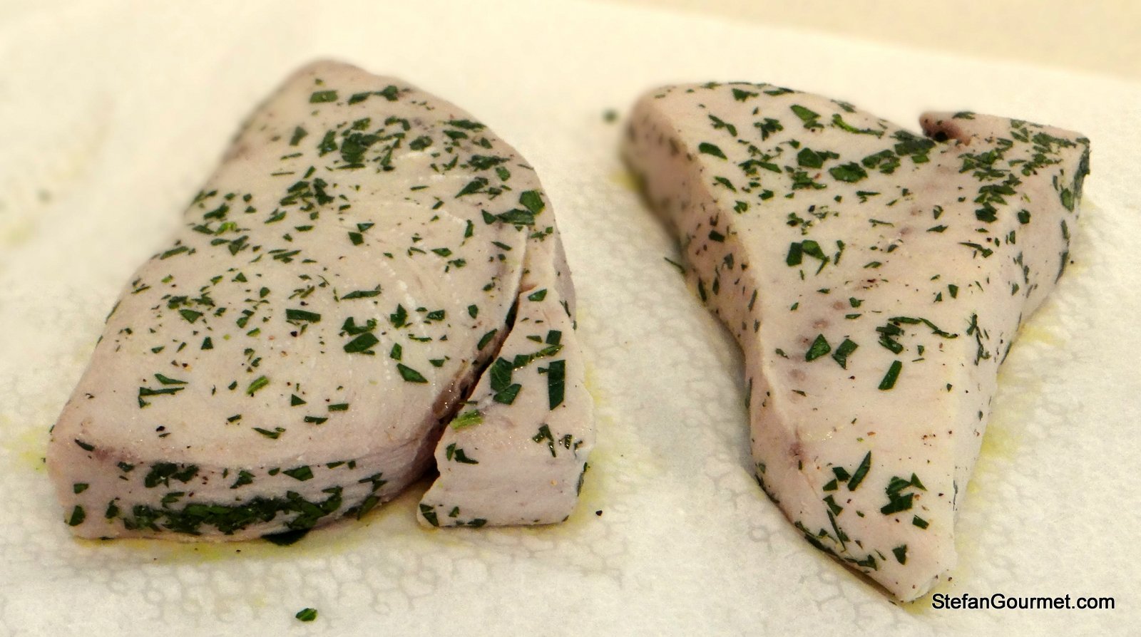 Swordfish combines well with an Italian marinade called Salmoriglio, consisting of extra virgin olive oil, parsley, and lemon juice. You could also add garlic and fresh oregano, but I preferred to keep it simple.