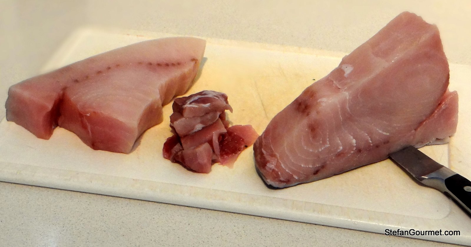 Cut the red ‘blood meat’ out of the swordfish and discard. It has an unpleasant fishy taste. Remove the skin as well.