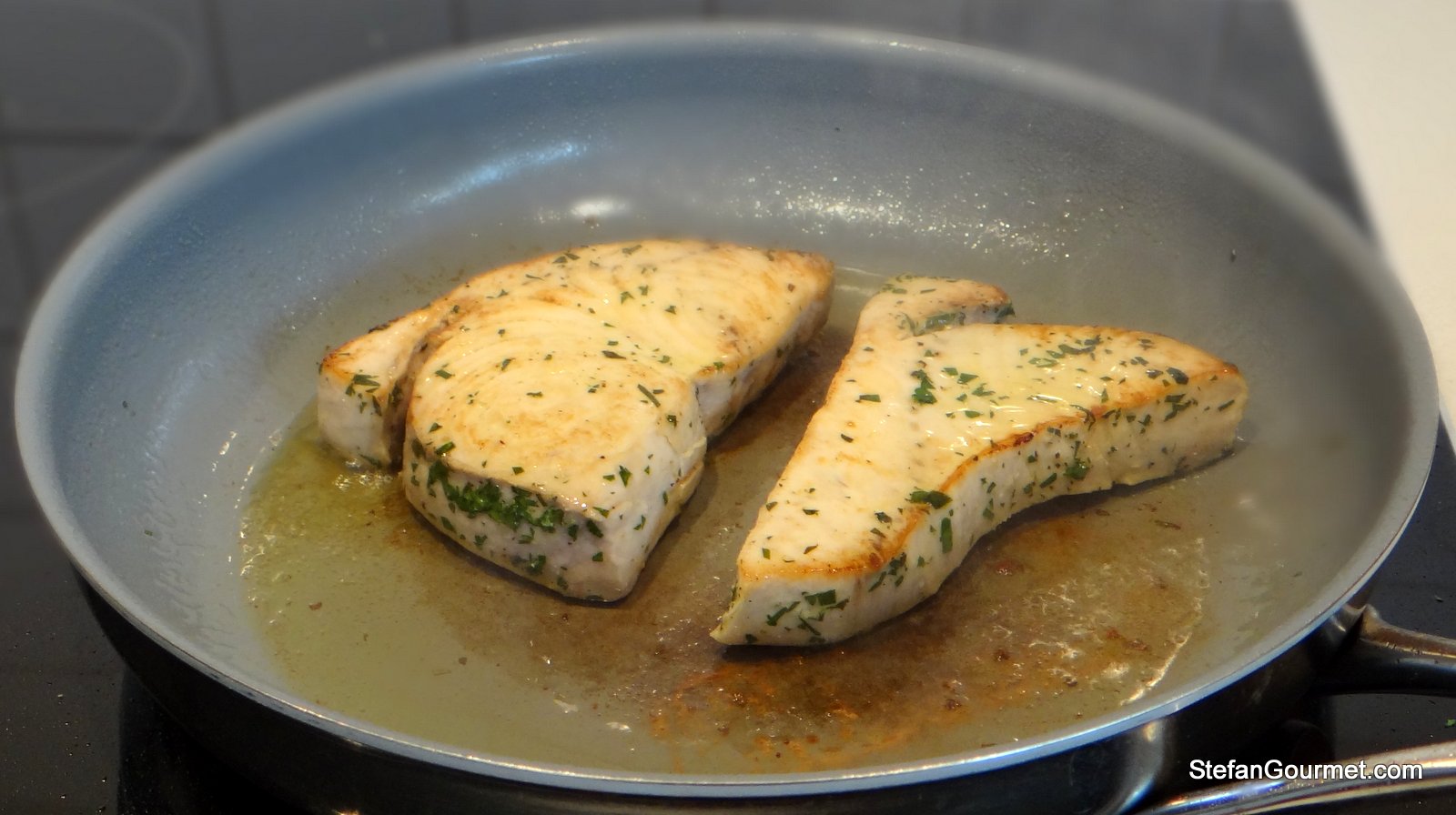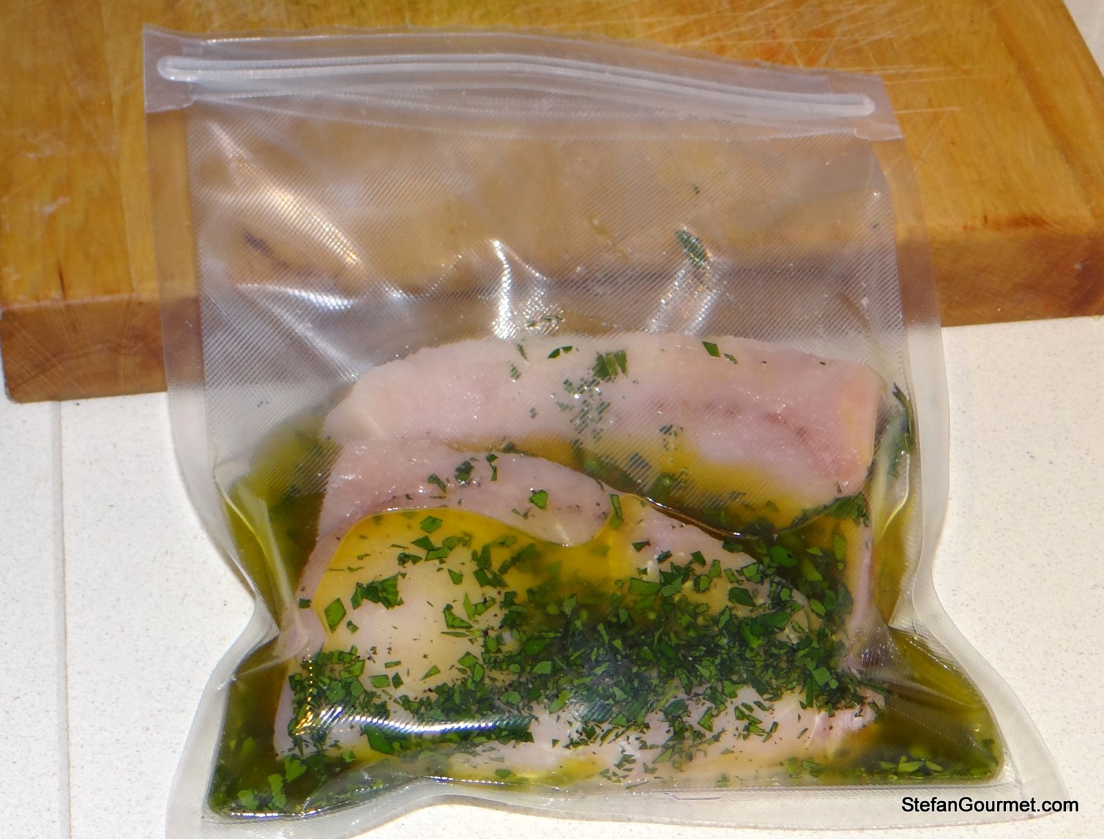 Swordfish is more meaty than most other fishes. So meaty in fact, that if the swordfish is really fresh and you cut away the ‘blood meat’, you could probably fool someone into thinking he’s eating meat rather than fish. There is one issue with swordfish and that is that it is often overcooked and dry. With swordfish this happens even more often that with other types of fish. By cooking the swordfish sous-vide, it will be very tender and juicy without risk of overcooking. The nice thing about cooking fish sous-vide is that it only takes a short time, so it is possible to cook the fish sous-vide without having a sous-vide water bath. You only need a digital thermometer for this to work.