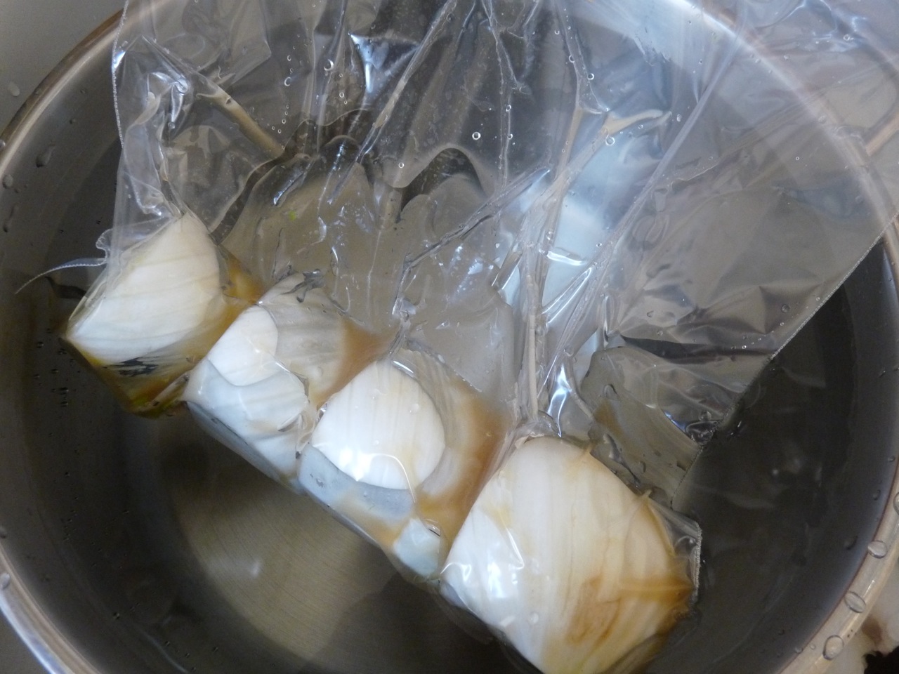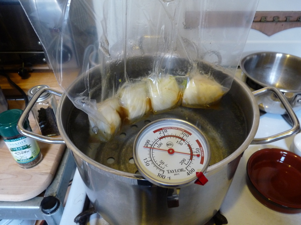 The bag floated a bit so I weighted it down with a heavy stainless steel skimmer. I monitored the temperature and adjusted the gas flame so that the temperature stayed around 85C/185F. After 45 minutes I finished the recipe following the Preparation section of Stefan’s recipe. It was delicious!