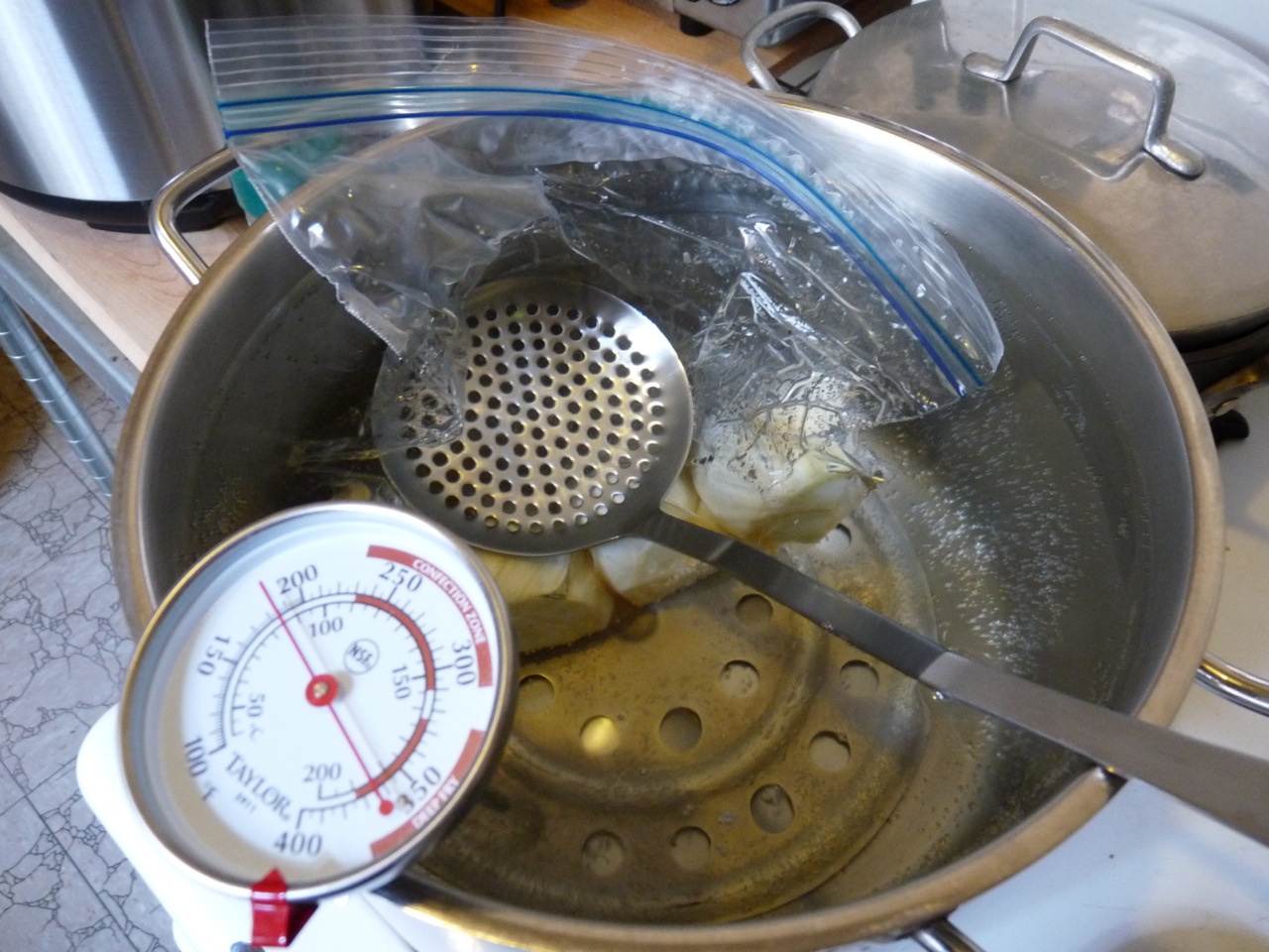 When the water reached a temperature of 85C/185F, I placed the Ziploc bag into the hot water.