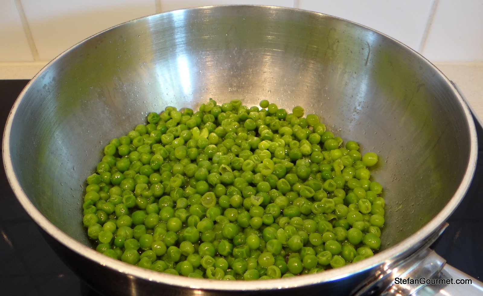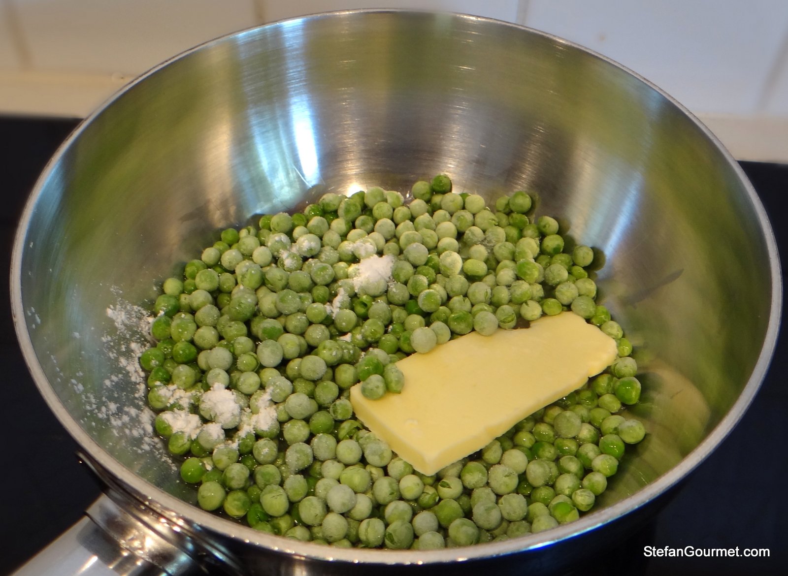 Put half the peas in a saucepan with 1 Tbsp butter and a bit of water. If you like you can also add 1/8 teaspoon baking powder to cook them faster and preserve the color.