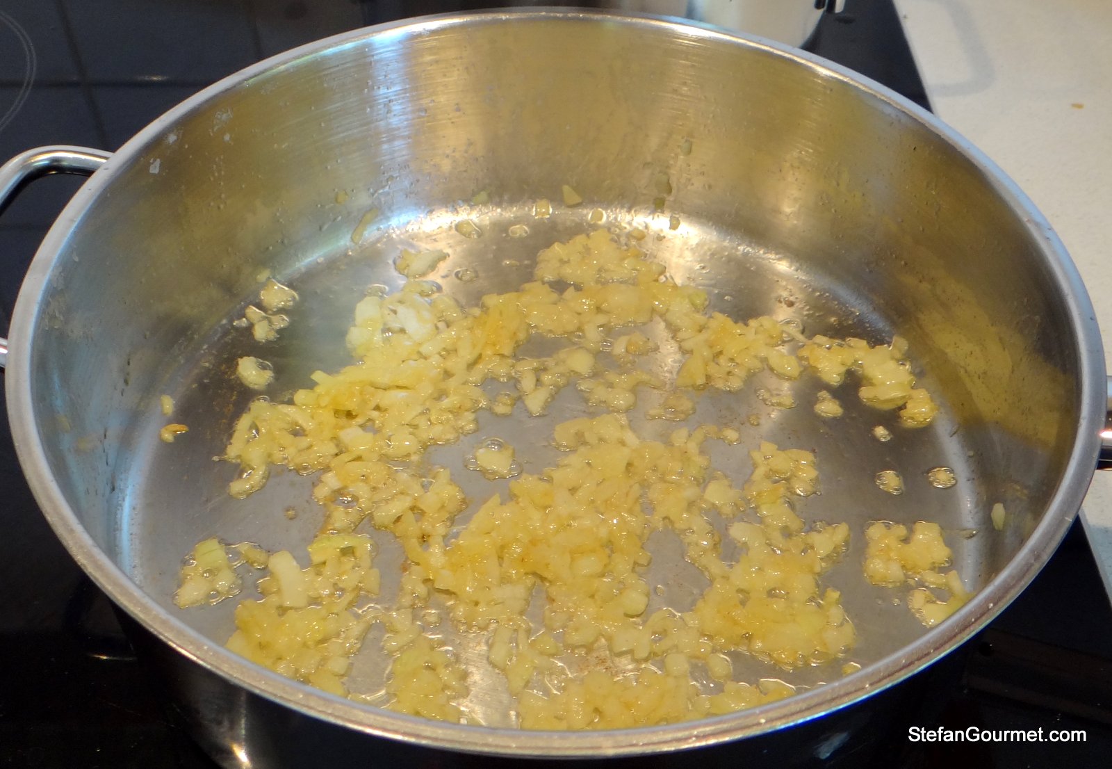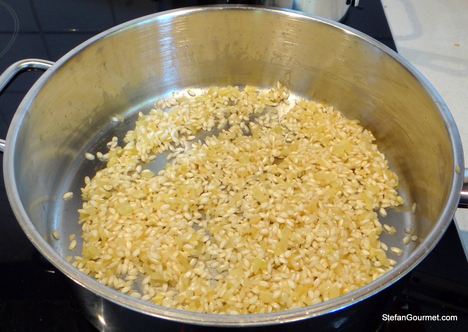 Heat 2 Tbsp butter in a thick-bottomed pan and sauté the onion until slightly golden, about 5 minutes. Meanwhile, heat up the vegetable stock and keep it simmering.