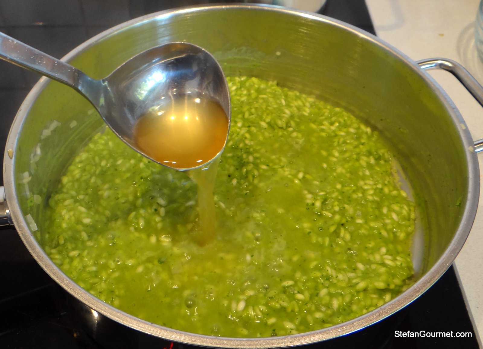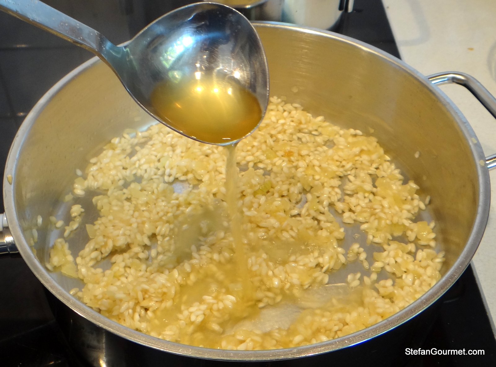 Cook over medium heat, stirring, until the stock has evaporated. Then add another ladle of stock. Keep stirring and adding stock until the rice is cooked al dente, about 16-18 minutes.