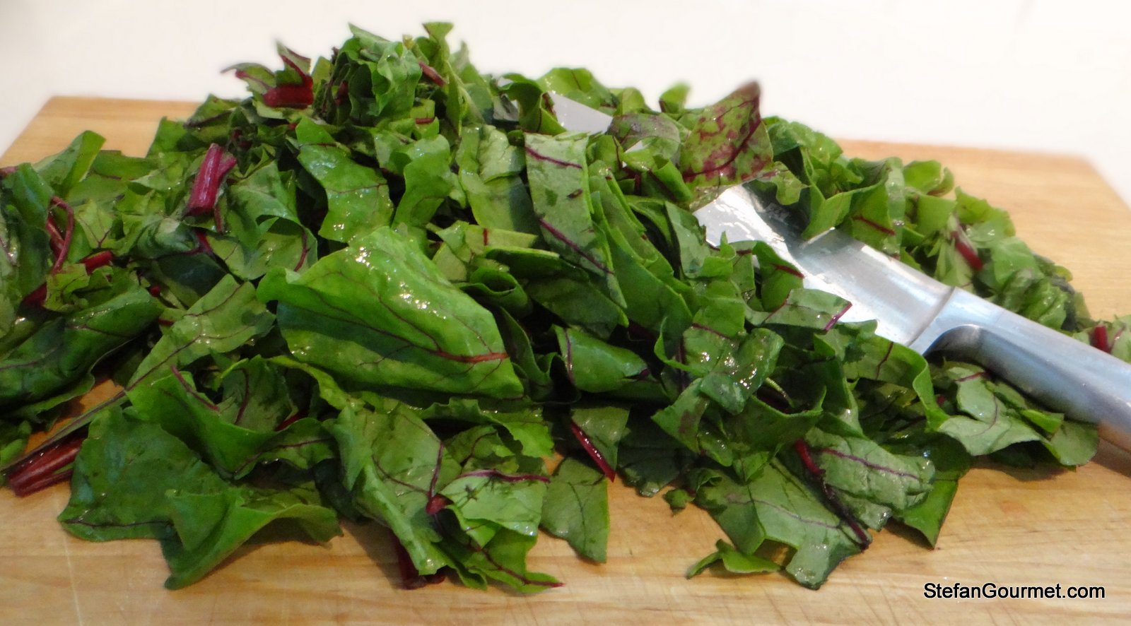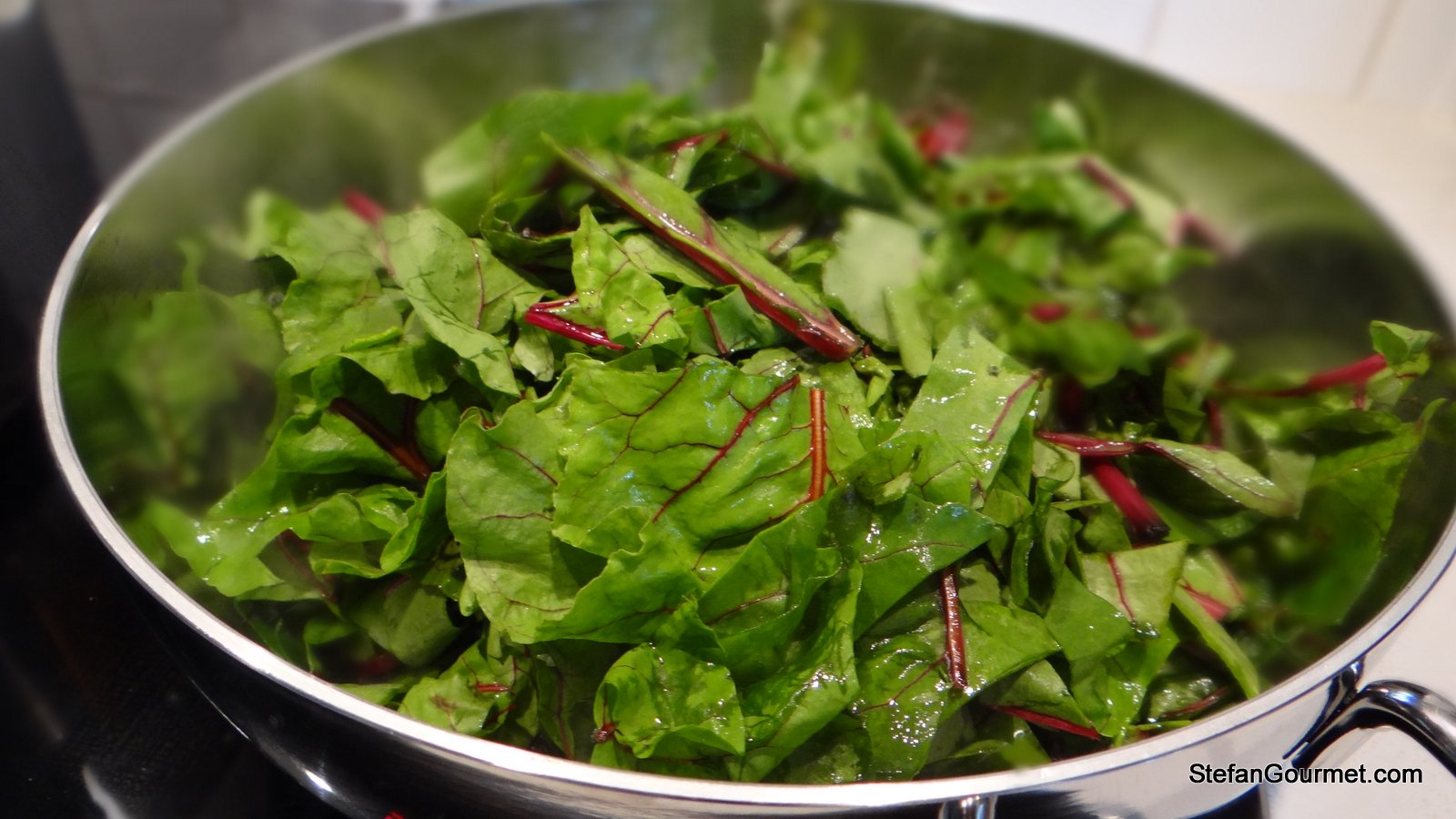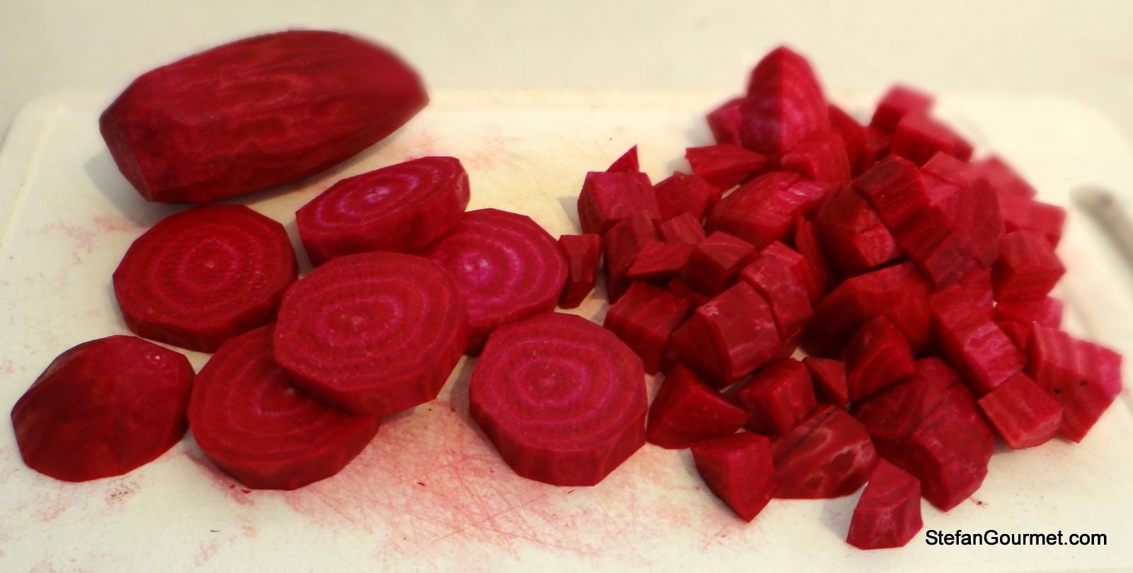 Separate the beets from the greens, reserving the greens and the stems. Peel the beets and cut into 1.5 cm (1/2 inch) cubes.