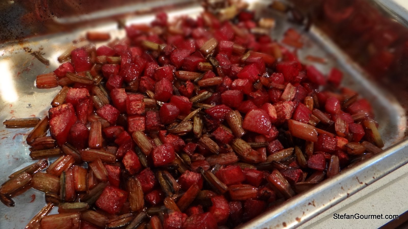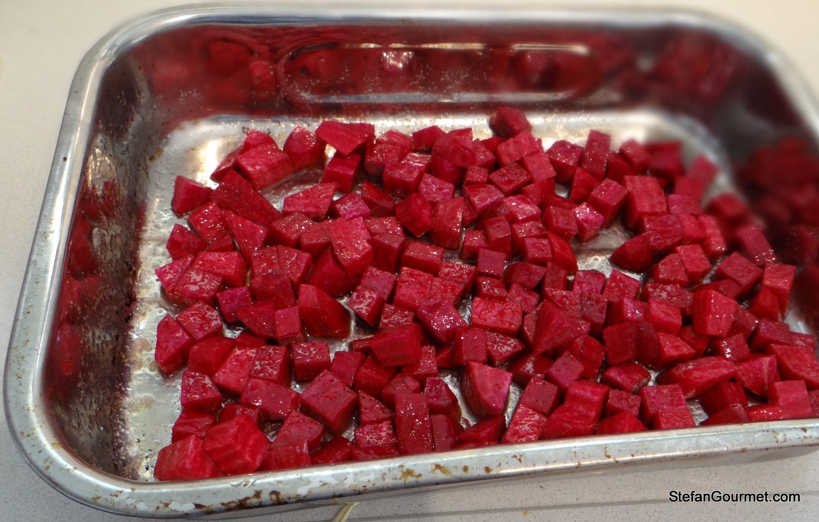 Chop the stems and add them to the beets after the first 20 minutes. Toss to mix and add some more oil if needed. Return to the oven and roast for another 20 minutes at 225C/450F or until the stems are crispy and the beets are cooked.