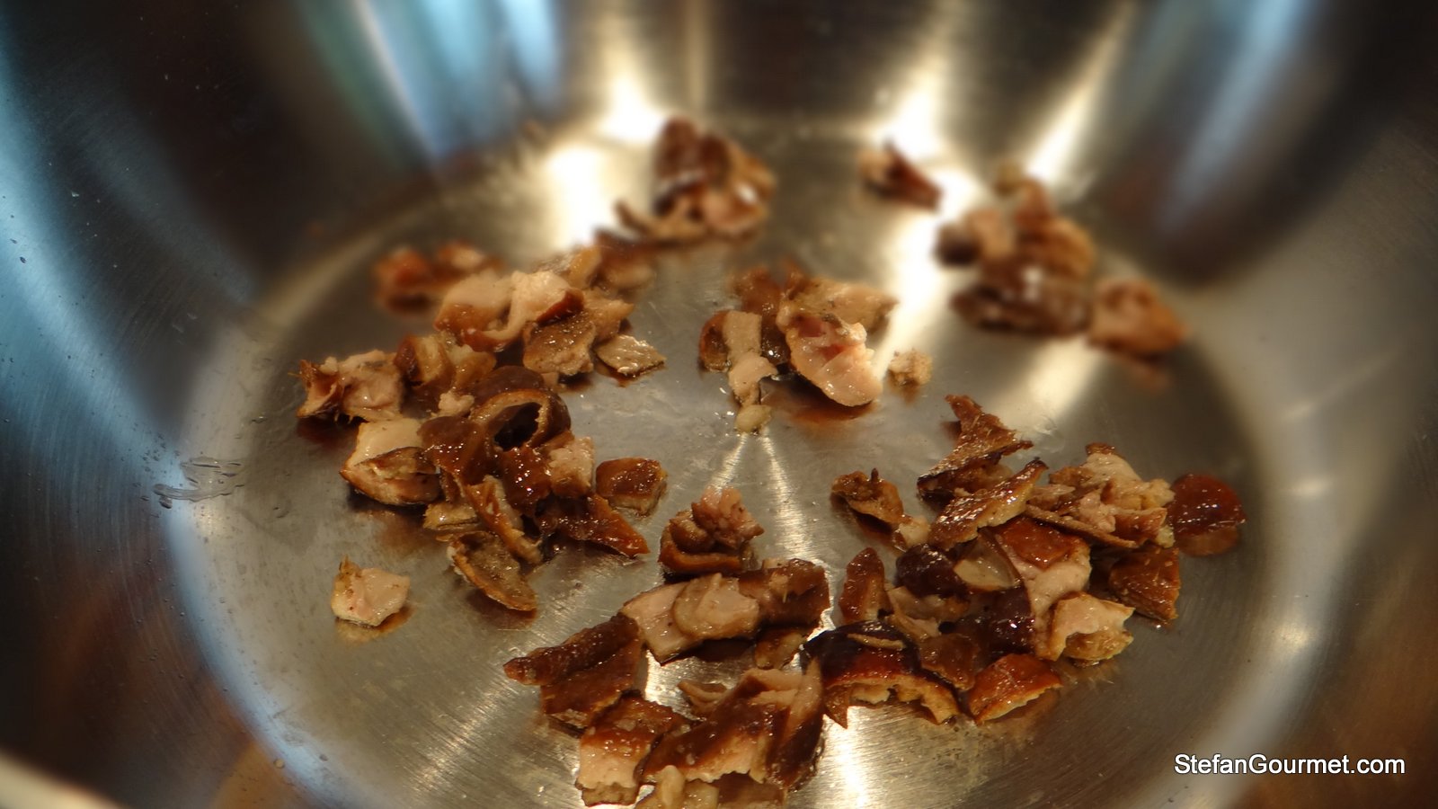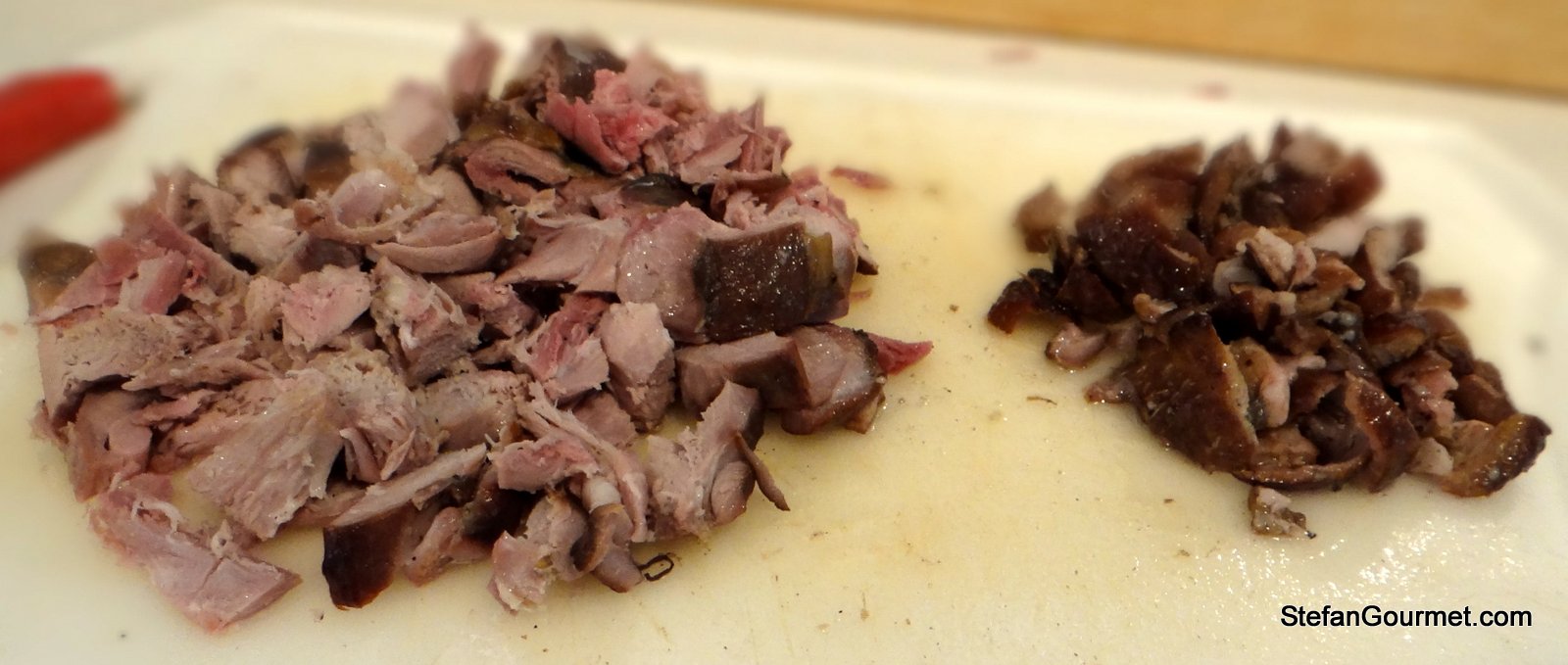 Remove the skin off the duck legs and reserve. Take the meat off the bones. Discard the bones.
