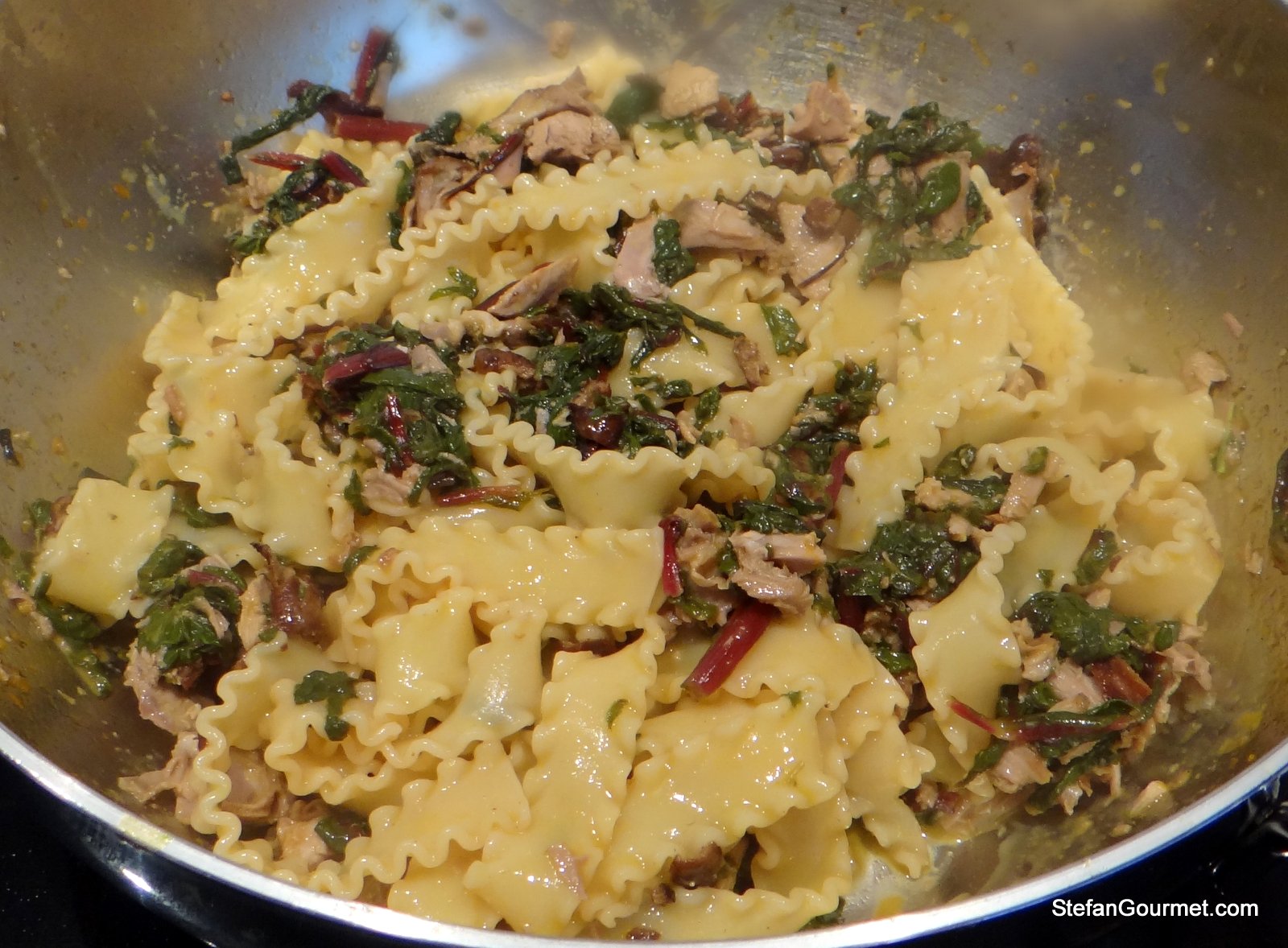 As soon as the pasta is al dente, drain and add to the duck sauce. Toss to mix.