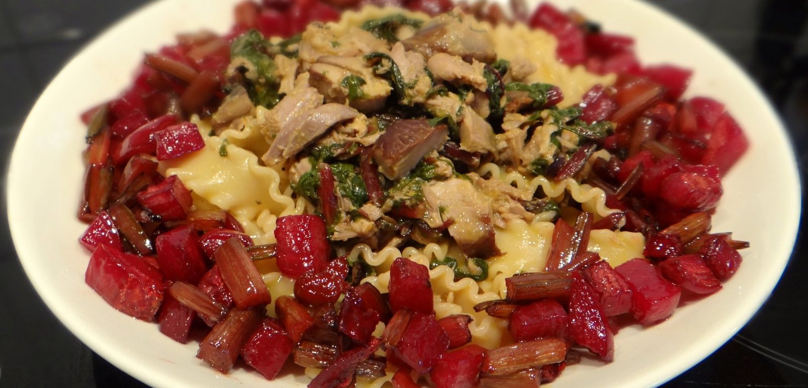 Serve the pasta with the duck sauce on warm plates, with the crispy beetroot around it.