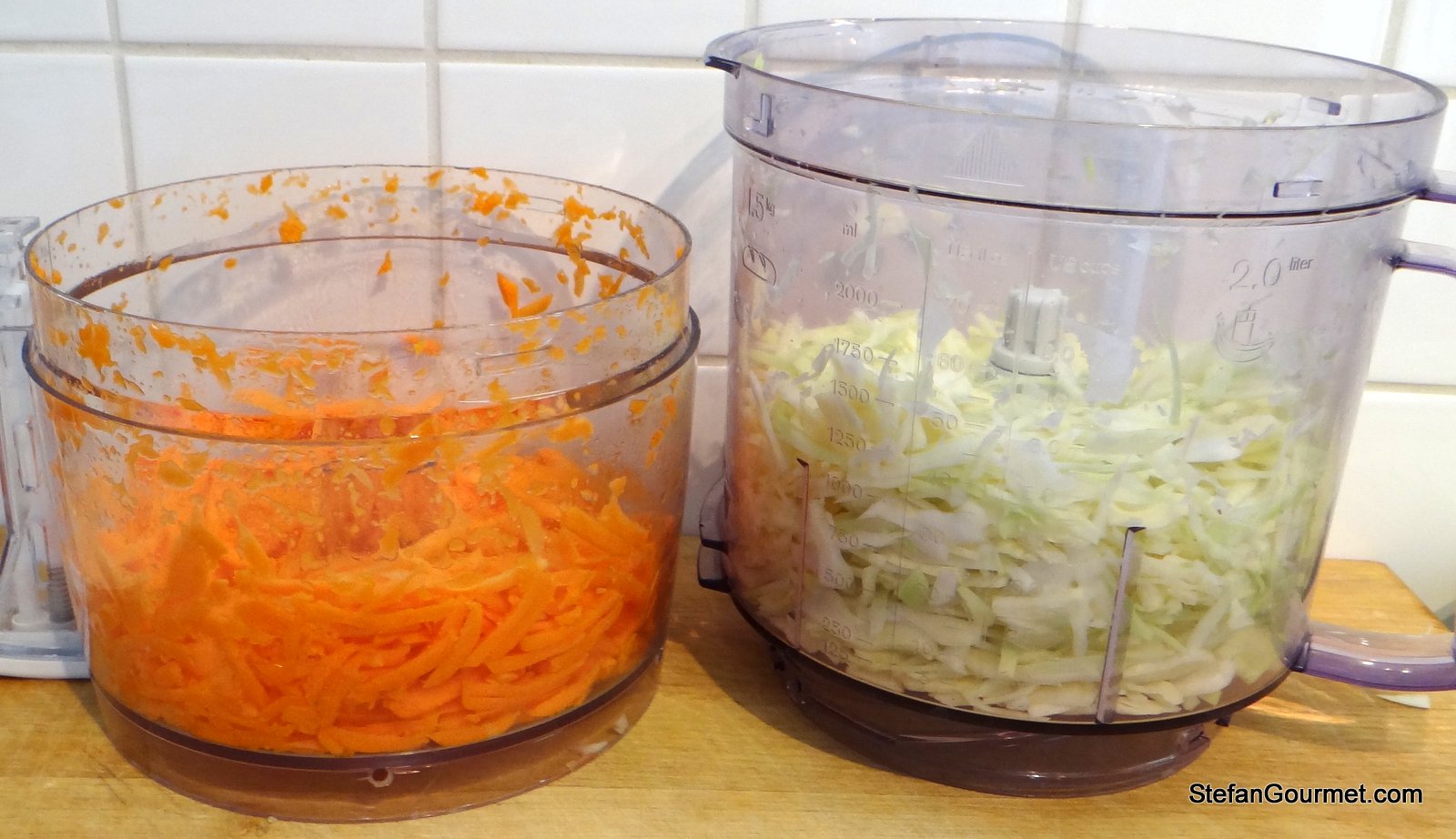 For the atjar, shred carrot and cabbage. This is easiest using a food processor.