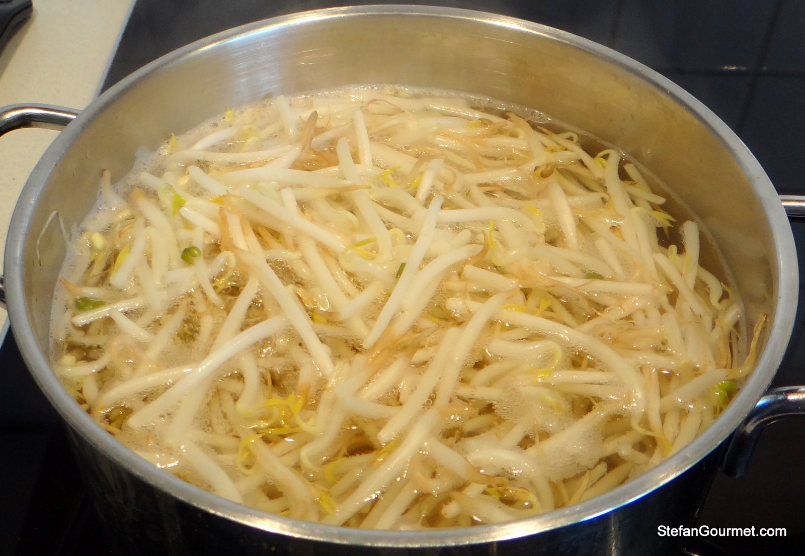 Blanch the bean sprouts in boiling water for 10 seconds. Drain and rinse with cold water.