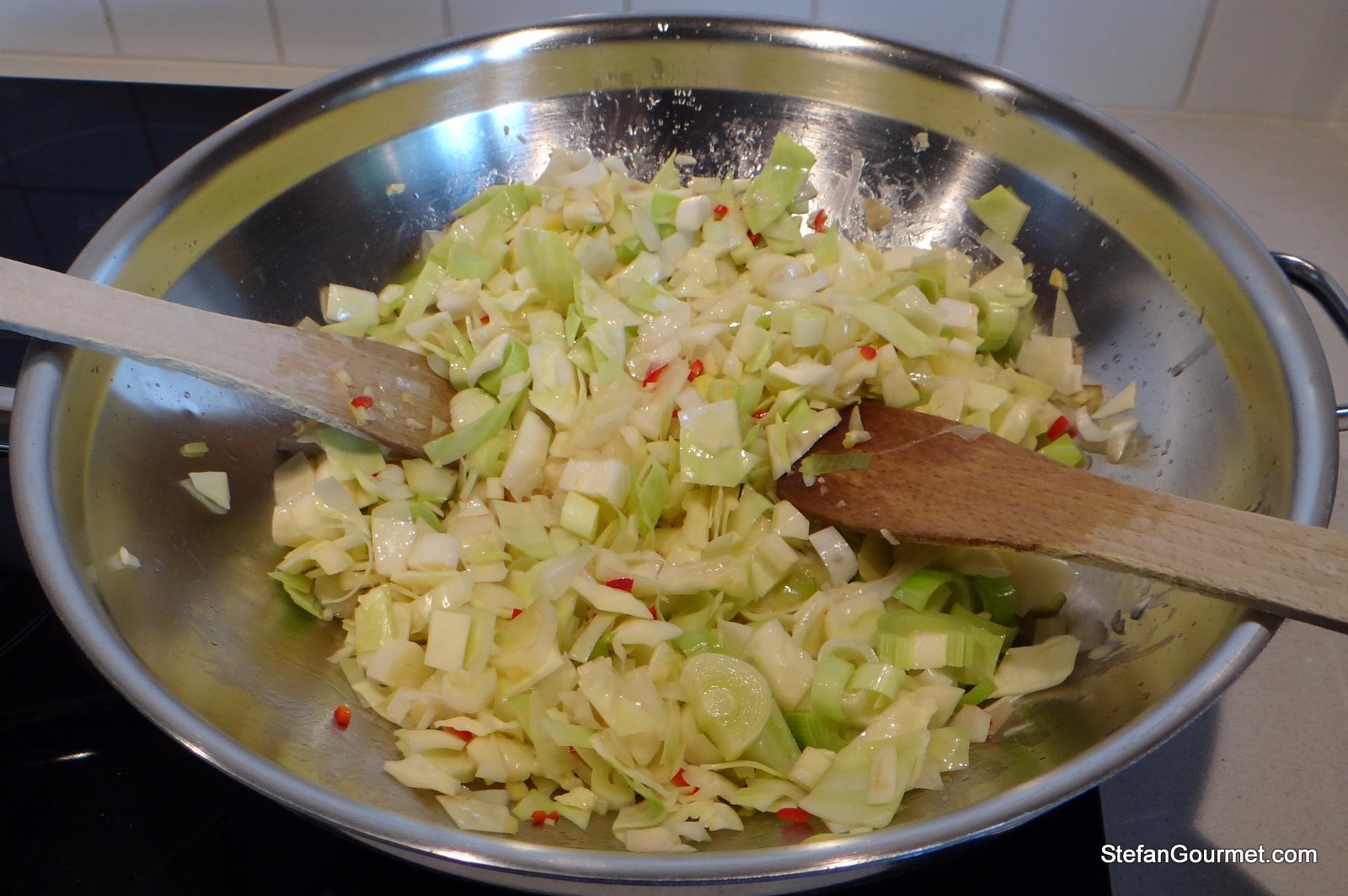 Heat stir fry oil in a wok. Add cabbage, onion, red chile pepper, garlic, ginger and leek. Stir fry for 3-4 minutes or until the vegetables start to color.