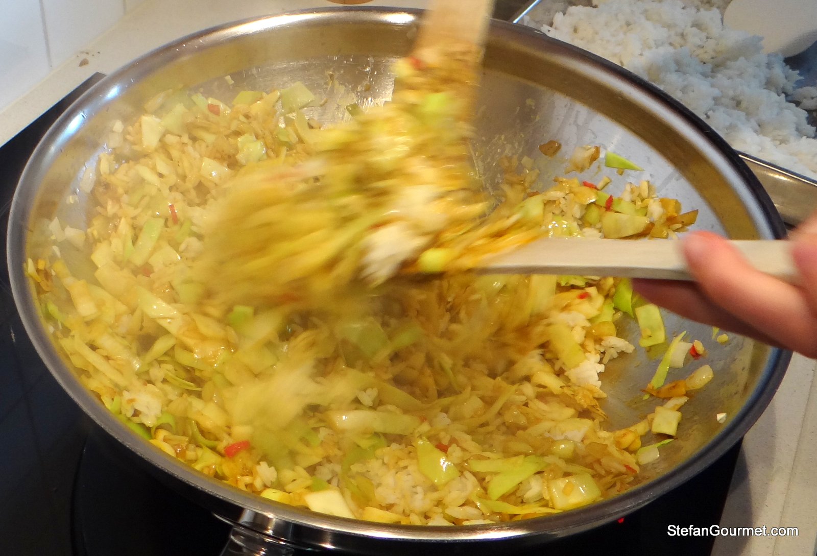Add spices, ketjap asin, and sambal oelek, followed by the rice in parts. Keep stir frying and adding rice until you have incorporated all of the rice.
