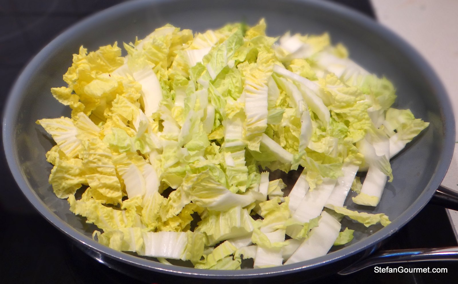 Meanwhile, heat some olive oil in a frying pan or wok and add the cabbage. Sauté over high heat for a few minutes or until the cabbage starts to color.