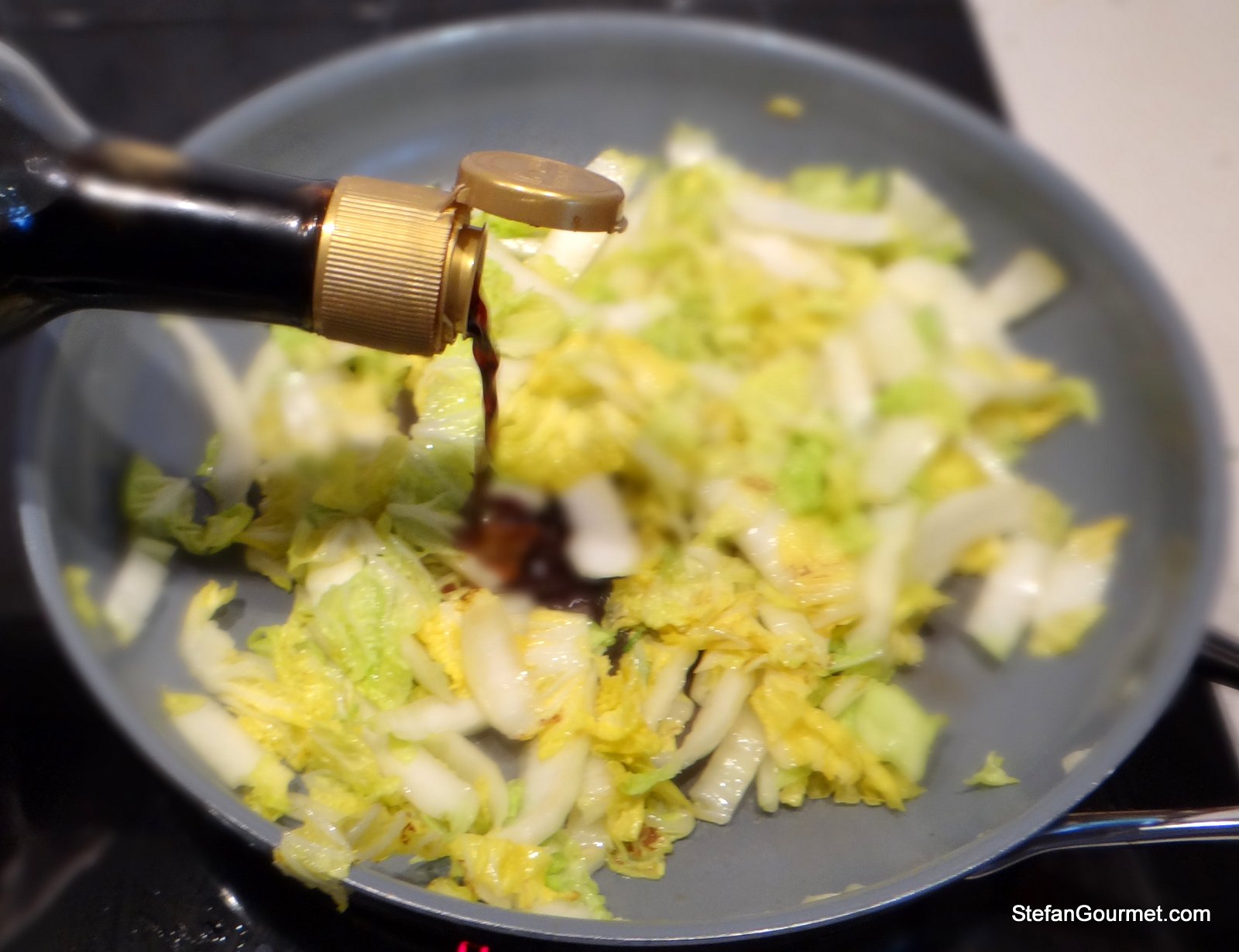 …and a bit of soy sauce. (I used about a tablespoon of each for 2 servings.) Continue to sauté over high heat until the liquid has almost gone. Turn off the heat.